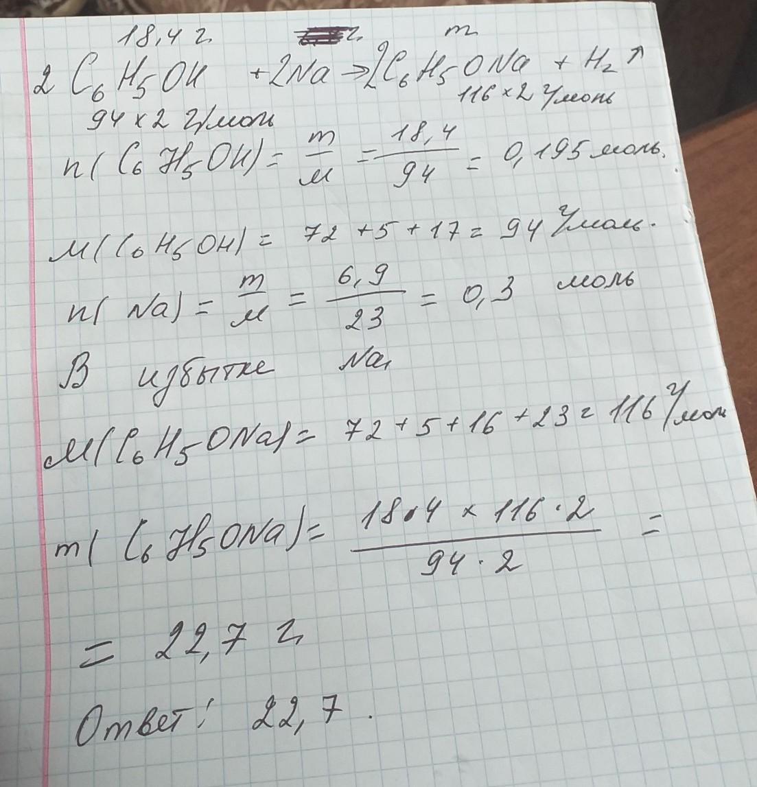 масса фенолята натрия, полученного при взаимодействии фенола массой 18,4 г с натрием массой 6,9 г, равна