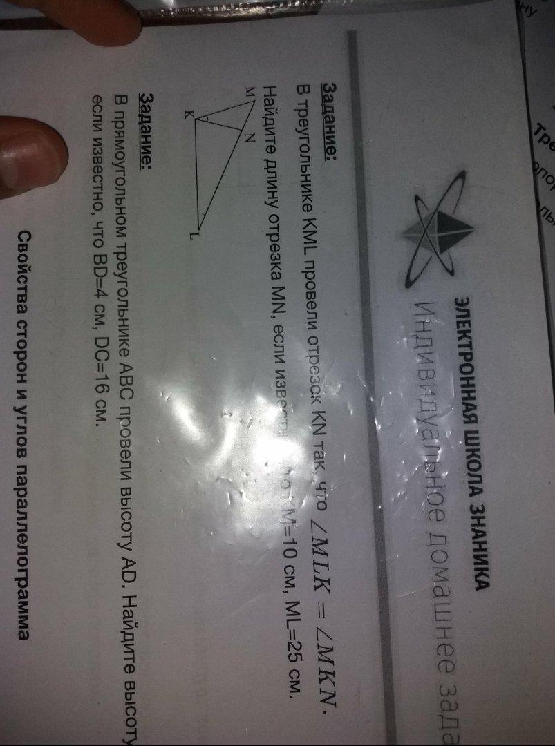 У треугольников MKN и KML угол М общий и ∠MLK = ∠MKN, следовательно, ΔMKN ~ ΔKML по двум углам. Из подобия треугольников следует, что
