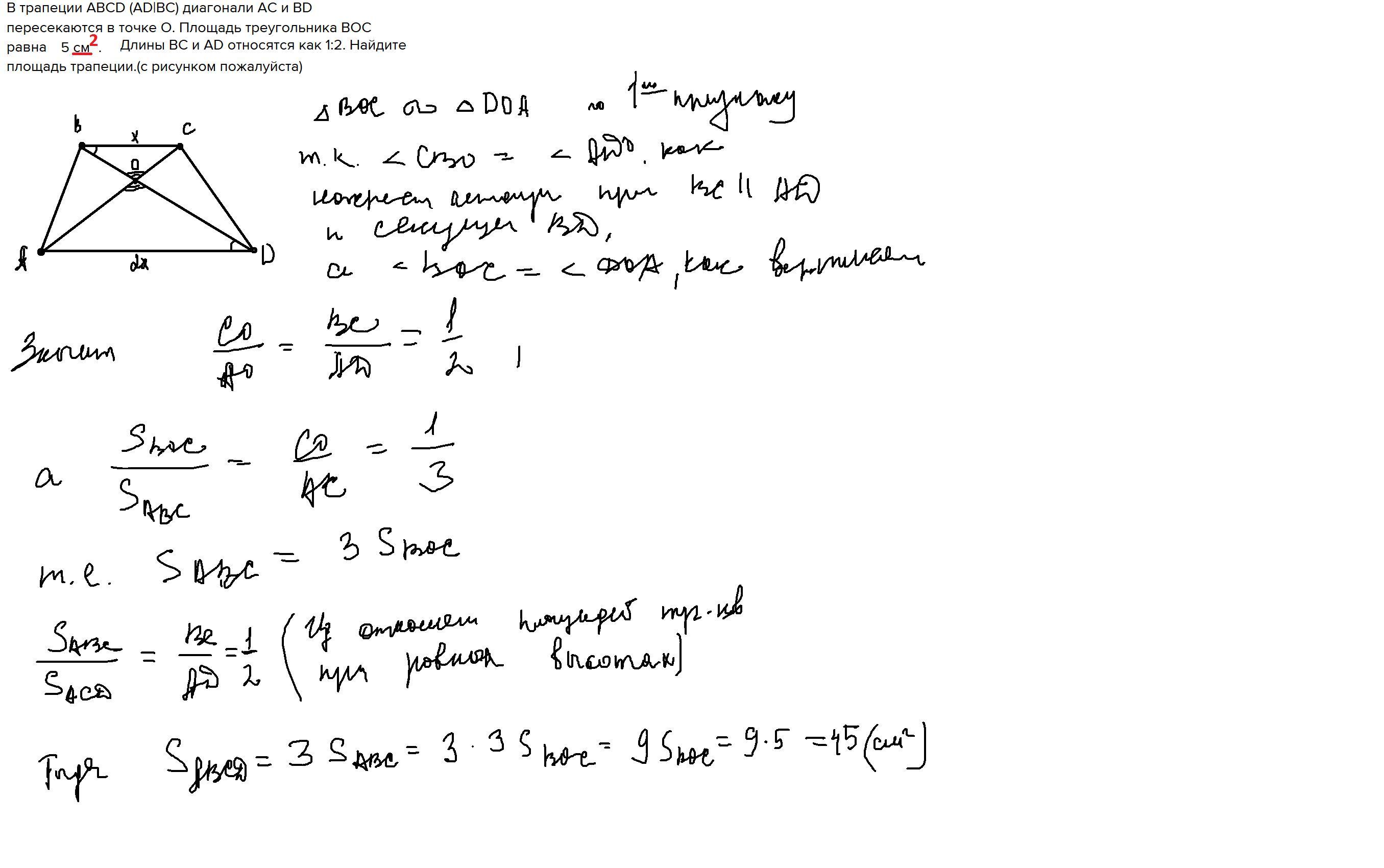 В трапеции АВСD (AD|BC) диагонали АС и ВD пересекаются в точке О. Площадь треугольника ВОС равна 5 см. Длины ВС и AD относятся как 1:2. Найдите площадь трапеции.(с рисунком пожалуйста)