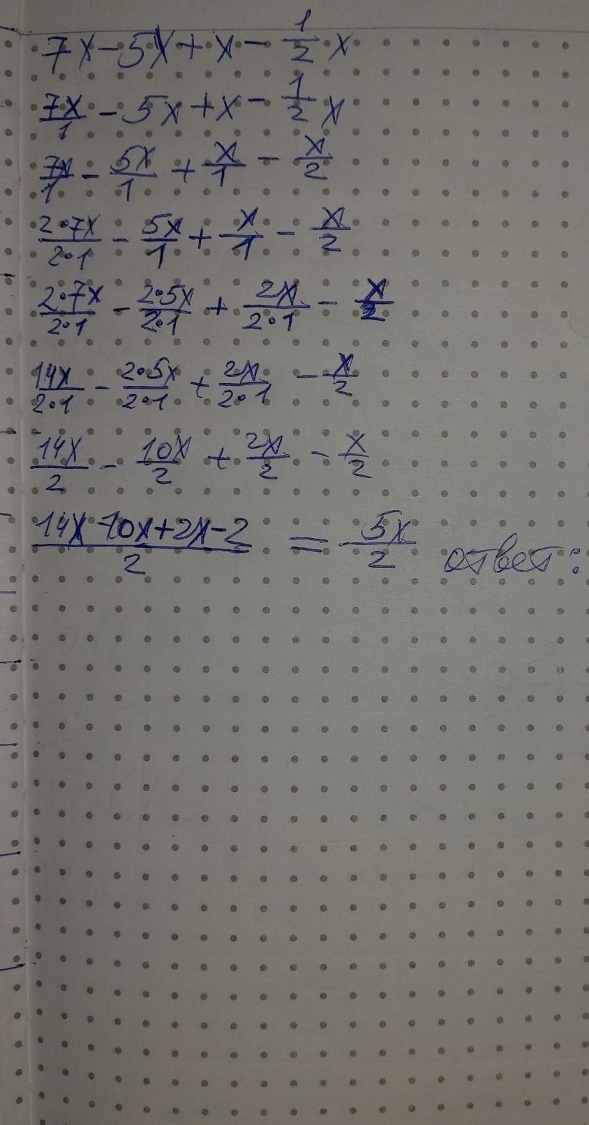 7x-5x+x-(1)/(2)x =(7х)/(1)-(5х)/(1)+(х)/(1)-(х)/(2)=(2*7х)/(2*1) - (2*5х)/(2*1) + (2х)/(2-1) - (х)/(2) = (14х)/(2)-(10х)/(2) + (2х)/(2) - (х)/(2) = (14х-10х+2х-х)/(2) - (5х)/(2) = (5)/(2)х = 2,5х