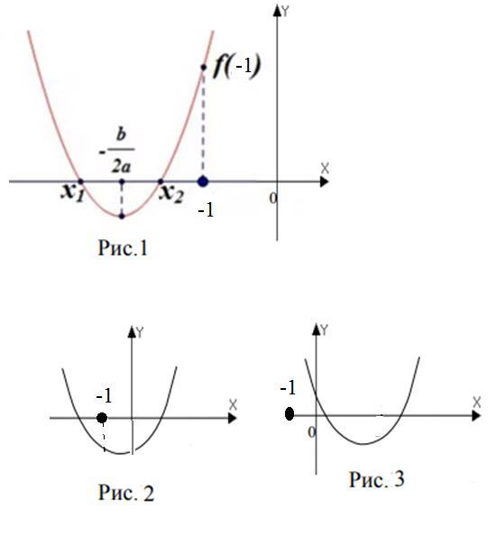 Если D>0, т.е. при a < -3 или a>1 уравнение имеет два корня и потому возможны три случая расположения параболы в системе координат ( см. рис.) по отношению к (-1)