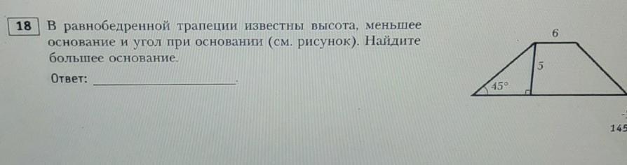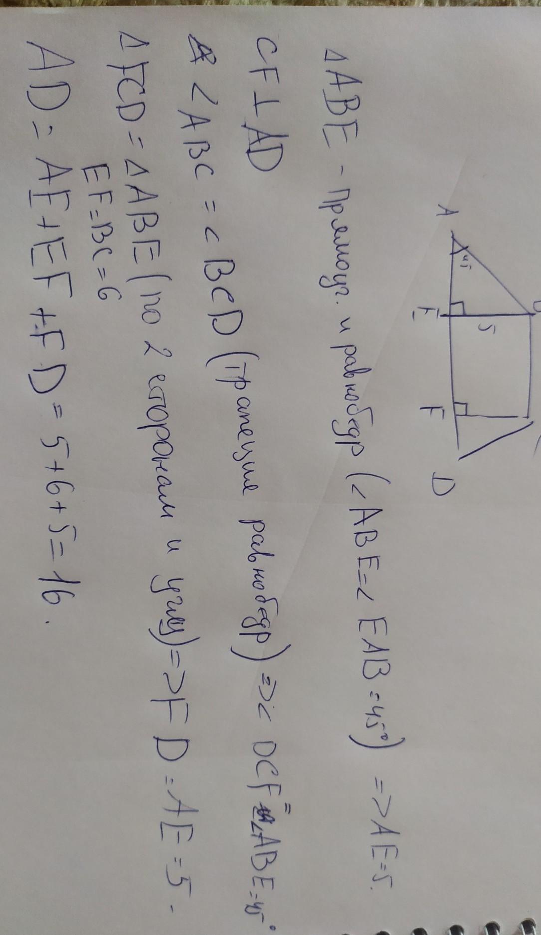 Т.к. трапеция равнобедренная, опустив высоту трапеции справа, получим такой же треугольник с катетами, равными 5.