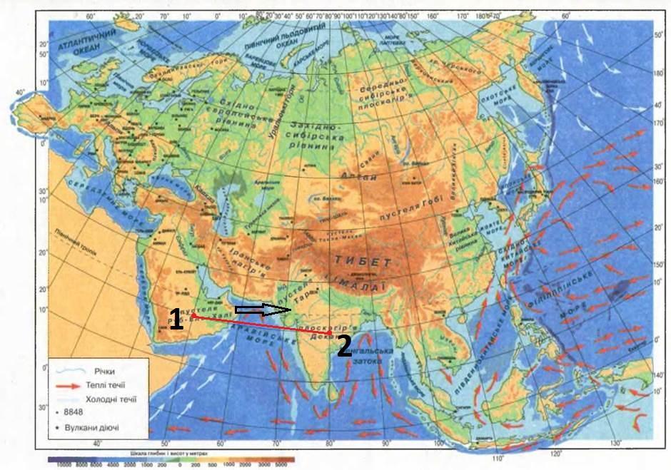 2.1. Поставьте точки на карте по приведённым ниже координатам. обозначьте эти точки соответственно цифрами 1 и 2.