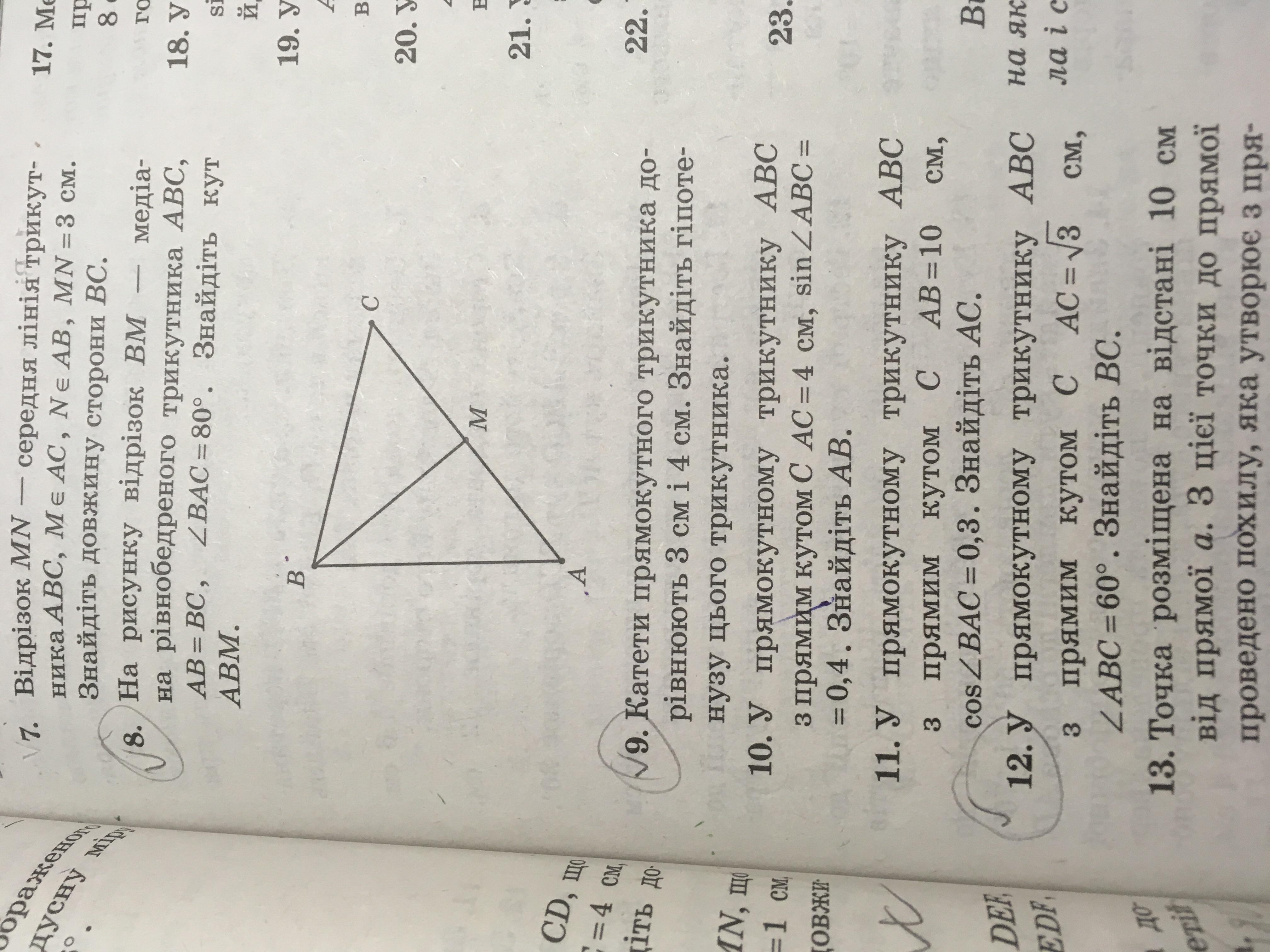 По 1 признаку равенства треугольников тр. АВМ и тр. МВС равны, следовательно угол АВМ=углу МВС, что означает, что медиана ВМ - биссектриса. По теореме о сумме углов треугольника угол В= 180-А-В В=180-80*2 В=20. По свойству биссектрисы угол АВМ=В:2 АВМ=20:2