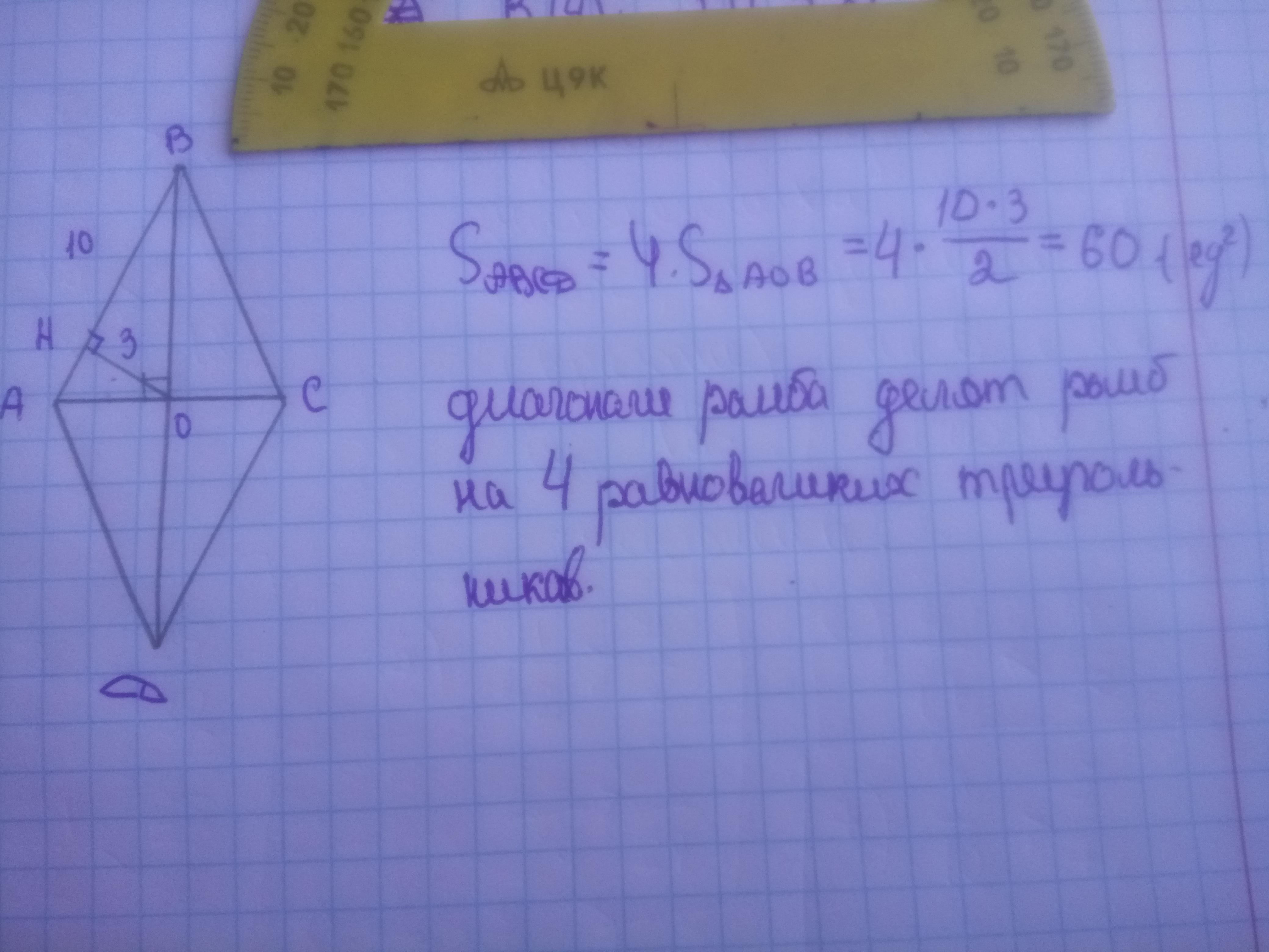 сторона ромба равна 10 а расстояние от точки пересечения диагоналей ромба до неё равно 3 найдите площадь этого ромба