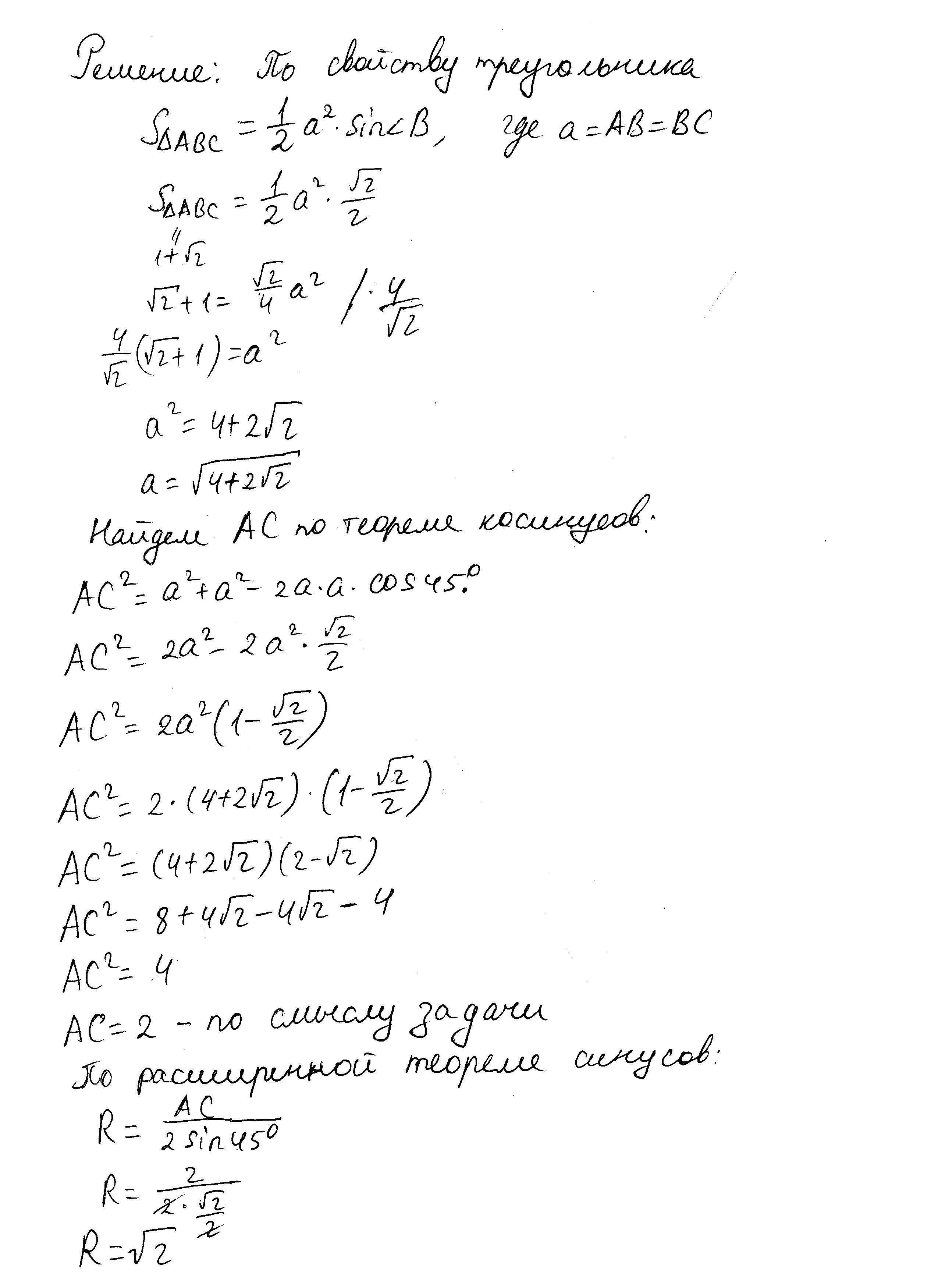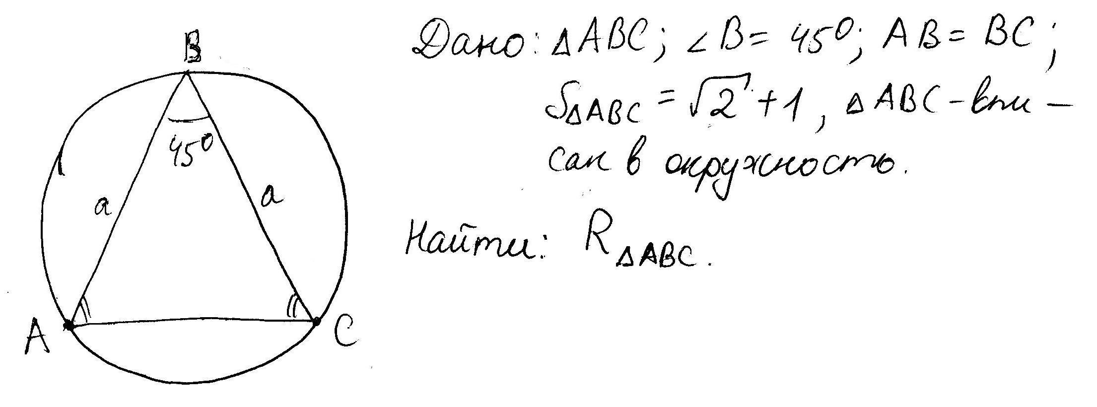 если площадь вписанного в окружность равнобедренного треугольника с углом 45° при вершине составляет