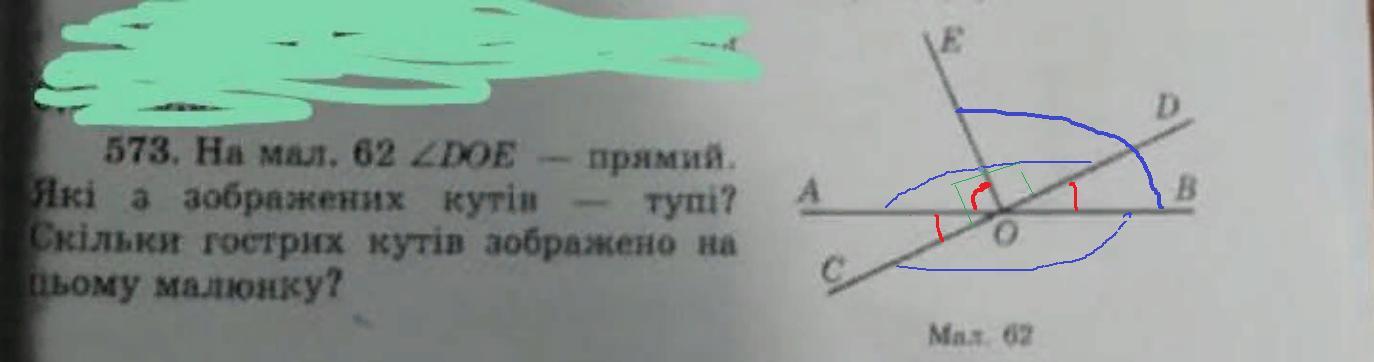 Тупые углы больше, чем прямой. Это: ∠АОD; ∠ВОЕ; ∠ВОС (отмечены синим цветом)