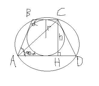 В равнобокую трапецию вписан круг радиуса r. Боковая сторона трапеции составляет с меньшим основанием угол а. Найдите радиус круга, описанного возле трапеции.