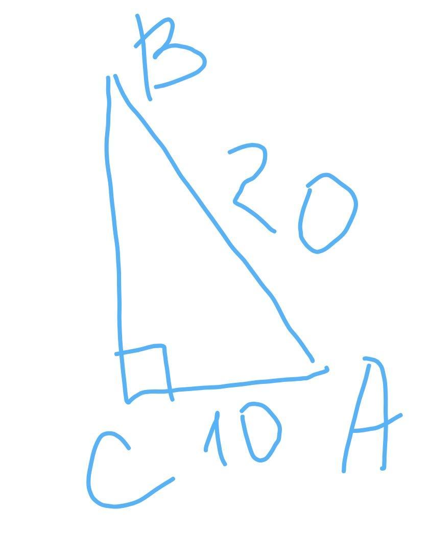 ПО условию гипотенуза АВ=20 см, катет, в два раза меньший гипотенузы, а именно катет АС, лежит против угла в 30°, значит, угол В равен 30°, а т.к. сумма острых углов в прямоугольном треугольнике равна 90°, то угол А равен 90°- 30°=60°