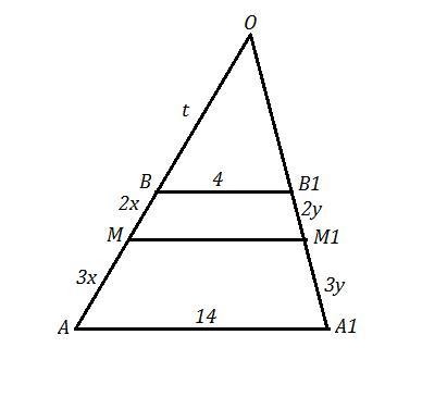 Так как АА1 || BB1 || MM1 , то получим три подобных треугольника: ΔОВВ1≈ΔОММ1≈ΔОАА1 (все по 2-м соответственным углам) . Из подобия следует пропорциональность соответственных сторон: