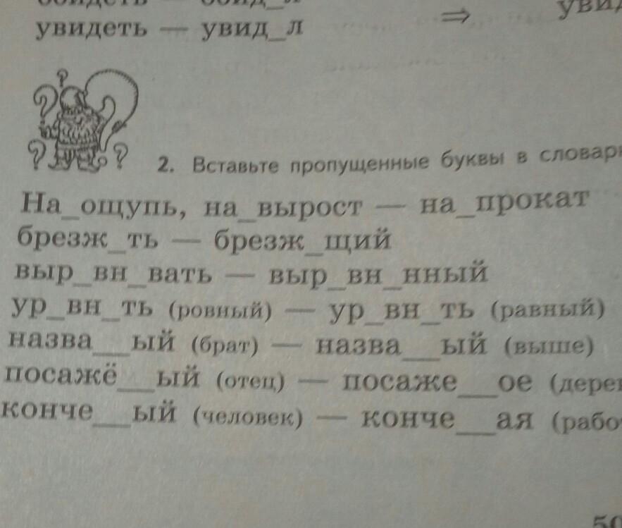 На ощупь, на вырост - напрокат; брезжить - брезжащий; выравнивать - выравненный; уровнять (ровный) - уравнять (равный); названый (брат) - названный (выше); посажёный (отец) - посаженное (дерево); конченый (человек) - конченная (работа).