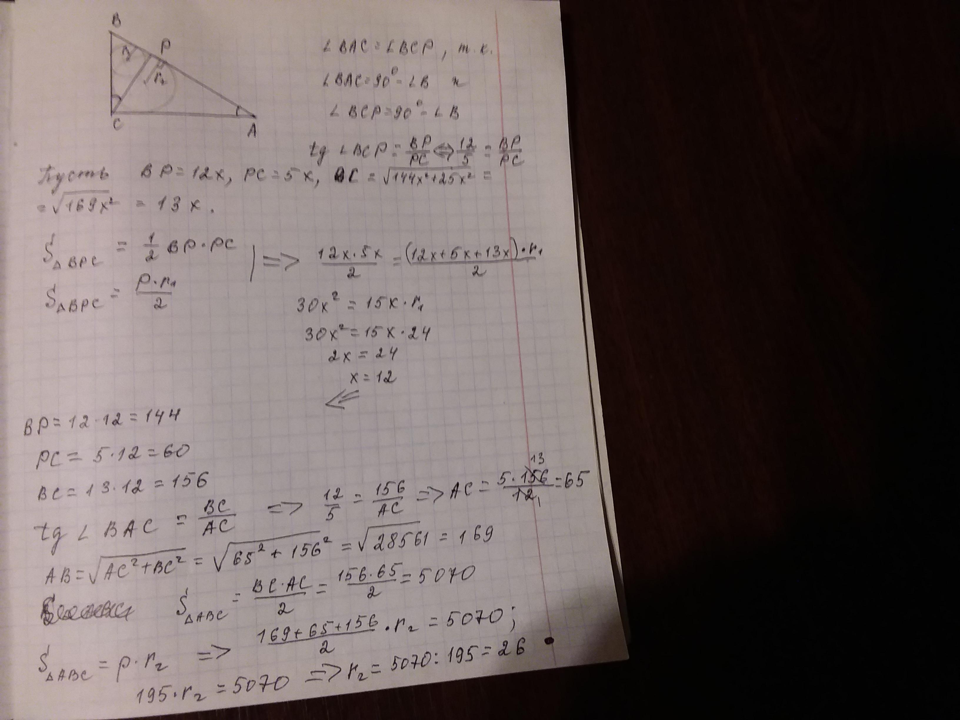 tg∠CAP = 12/5, по определению тангенса из ΔACP