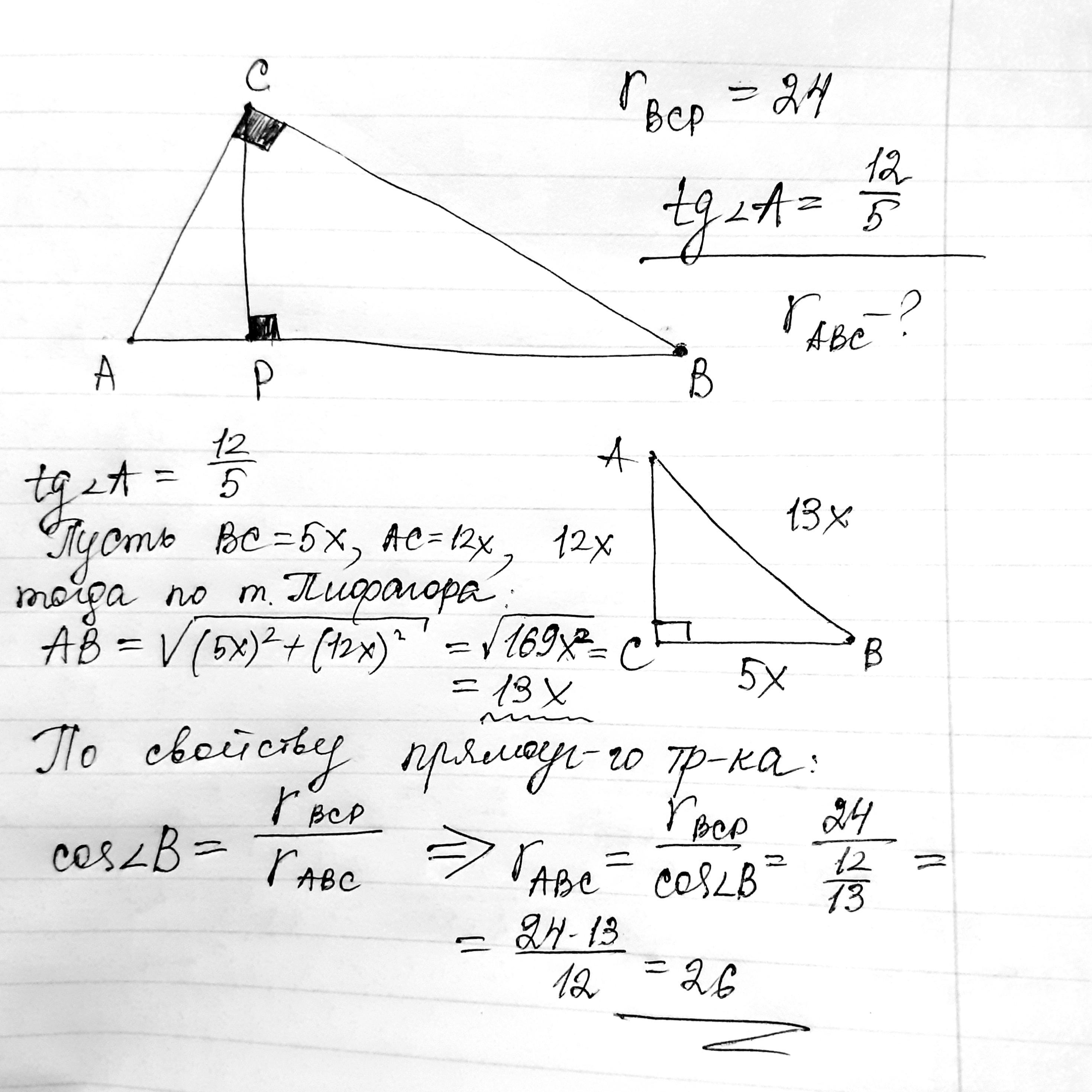 Из вершины прямого угла C треугольника ABC проведена высота CP. Радиус окружности, вписанной в треугольник BCP, равен 24, тангенс угла BAC равен 12/5 Найдите радиус окружности, вписанной в треугольник ABC.