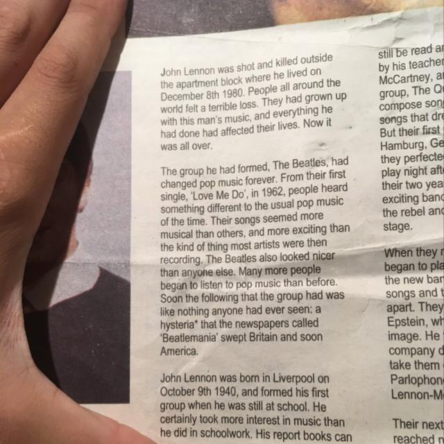 8 декабря 1980 года Джон Леннон был застрелен возле многоквартирного дома, где он жил. Люди во всем мире чувствовали ужасную потерю. Они выросли на музыке этого человека, и все, что он делал, повлияло на их жизнь. Теперь все было кончено. Группа, которую он создал, Битлз, навсегда изменила поп-музыку. От их первого сингла Love Me Do 'в 1962 году люди услышали что-то отличное от обычной поп-музыки того времени. Их песни казались более музыкальными, чем другие, и более захватывающими, чем то, что записывали большинство артистов. Битлз также выглядели лучше, чем кто-либо другой. Поп-музыку стали слушать гораздо больше людей, чем раньше. Вскоре группа стала похожа на то, что никто никогда не видел: истерию, которую газеты «Битлемания» охватили Британию, и вскоре американский литератор Джон Леннон был рожден в Ливерпуле 9 октября 1940 года. и создал свою первую группу, когда он был еще в школе. Он, безусловно, больше интересовался музыкой, чем школьной работой.