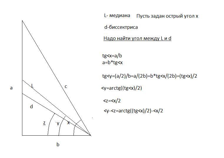 В прямоугольном треугольнике из вершины острого угла, равного а, проведены медиана и биссектриса. Найдите угол между медианой и биссектрисой.
