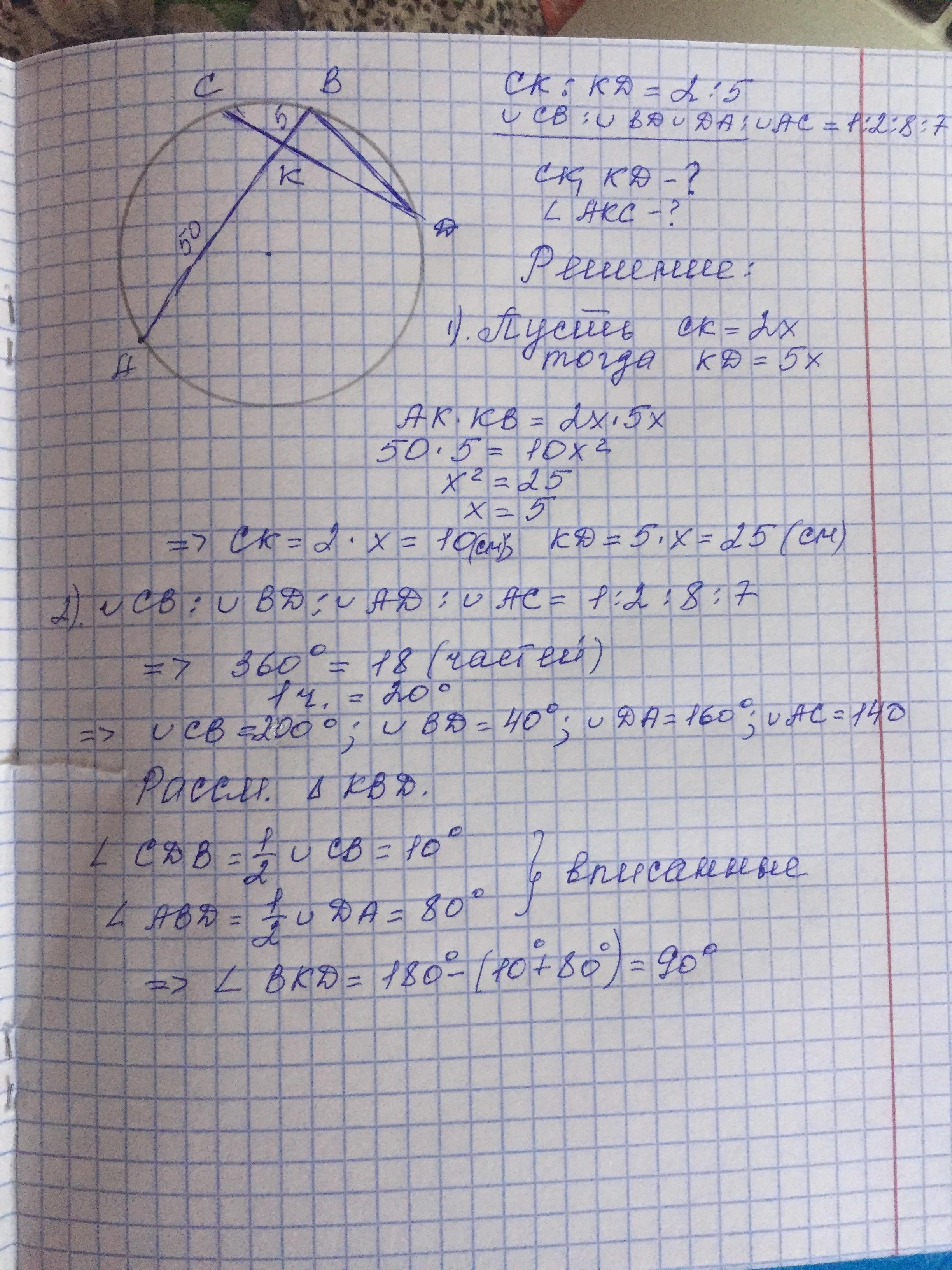 Одна из двух пересекающихся хорд разделилась их точкой пересечения на отрезки 5 и 50 см, а другая в отношении 2:5.