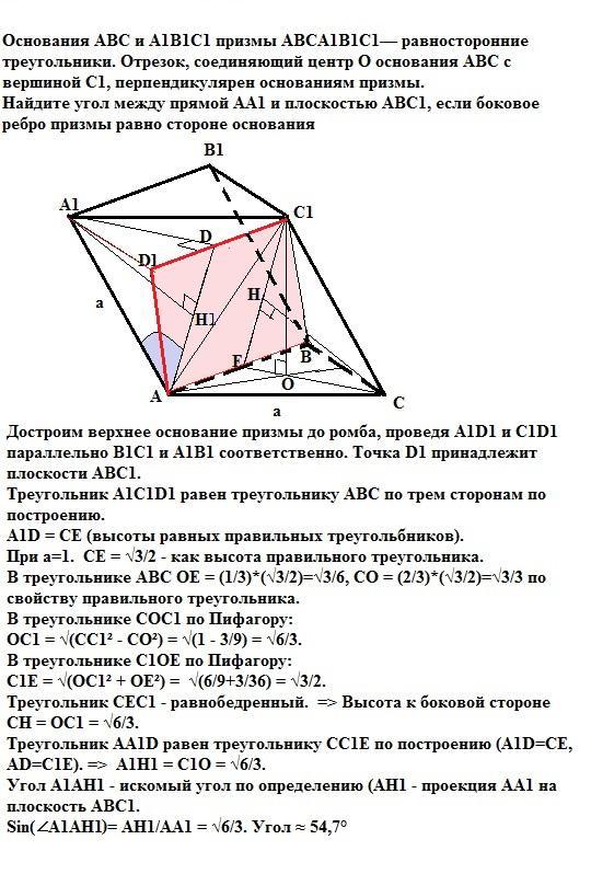 Sin(∠A1AH1) = AH1/AA1 = √6/3. Угол ≈ 54,7°