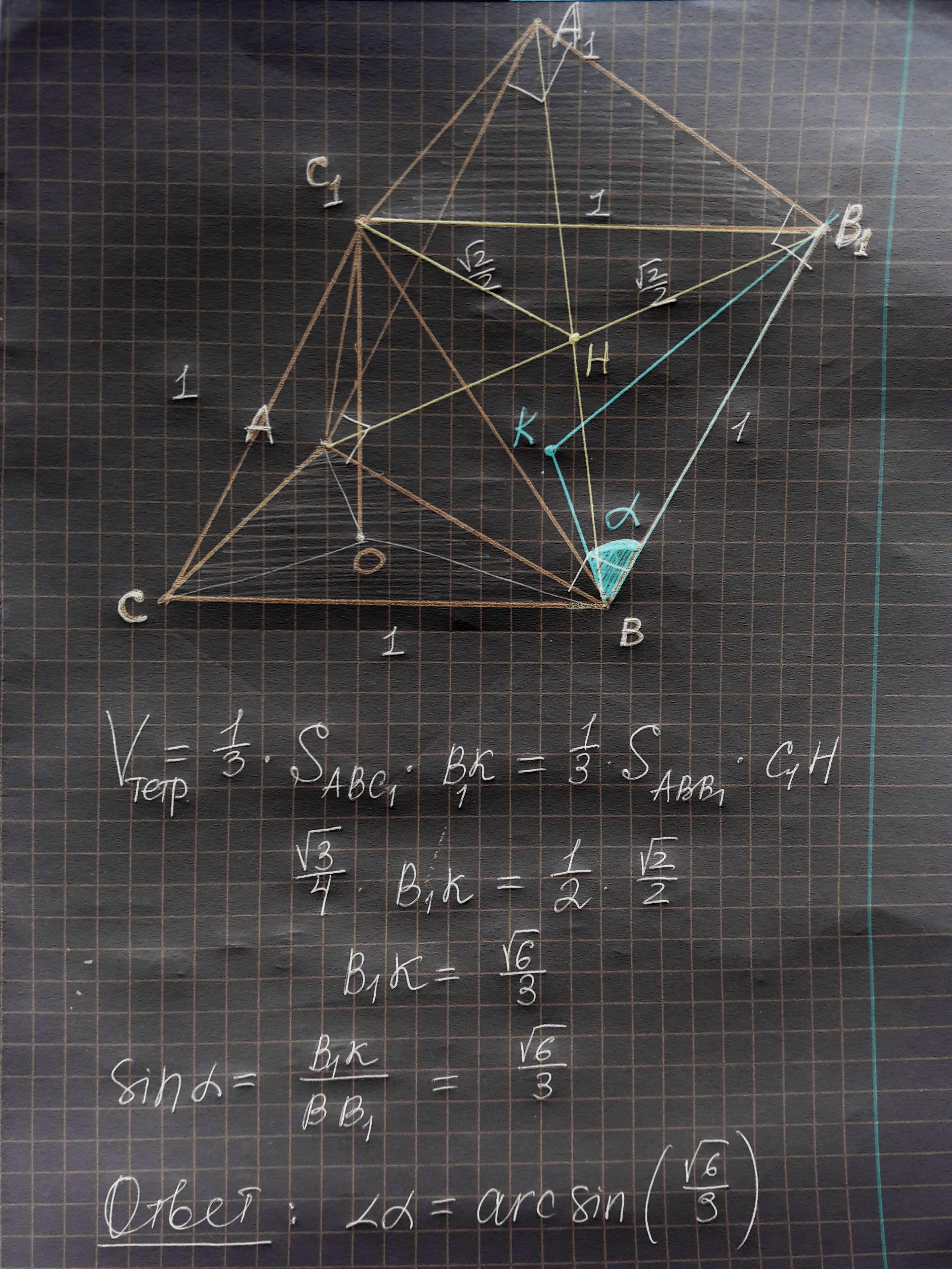 Sin(∠A1AH1) = √6/3. Угол ≈ 54,7°