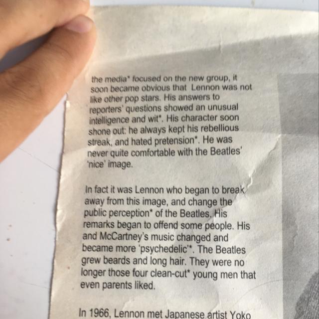 СМИ "сосредоточились на новой группе, вскоре стало очевидно, что Леннон не похож на других поп-звезд. Его ответы на вопросы журналистов показали необычный ум и остроумие. Его характер вскоре проявился: он всегда держал свою мятежную серию и ненавидел претенциозность. Ему никогда не было вполне комфортно с «милым» образом Битлз. На самом деле именно Леннон начал отрываться от этого образа и менять общественное восприятие «Битлз», его высказывания стали оскорблять некоторых людей. Музыка его и Маккартни изменилась и стал более «психоделическим». У Битлз росли бороды и длинные волосы. Это были уже не те четверо чистокровных юношей, которые нравились даже родителям. В 1966 году Леннон познакомился с японским художником Йоко