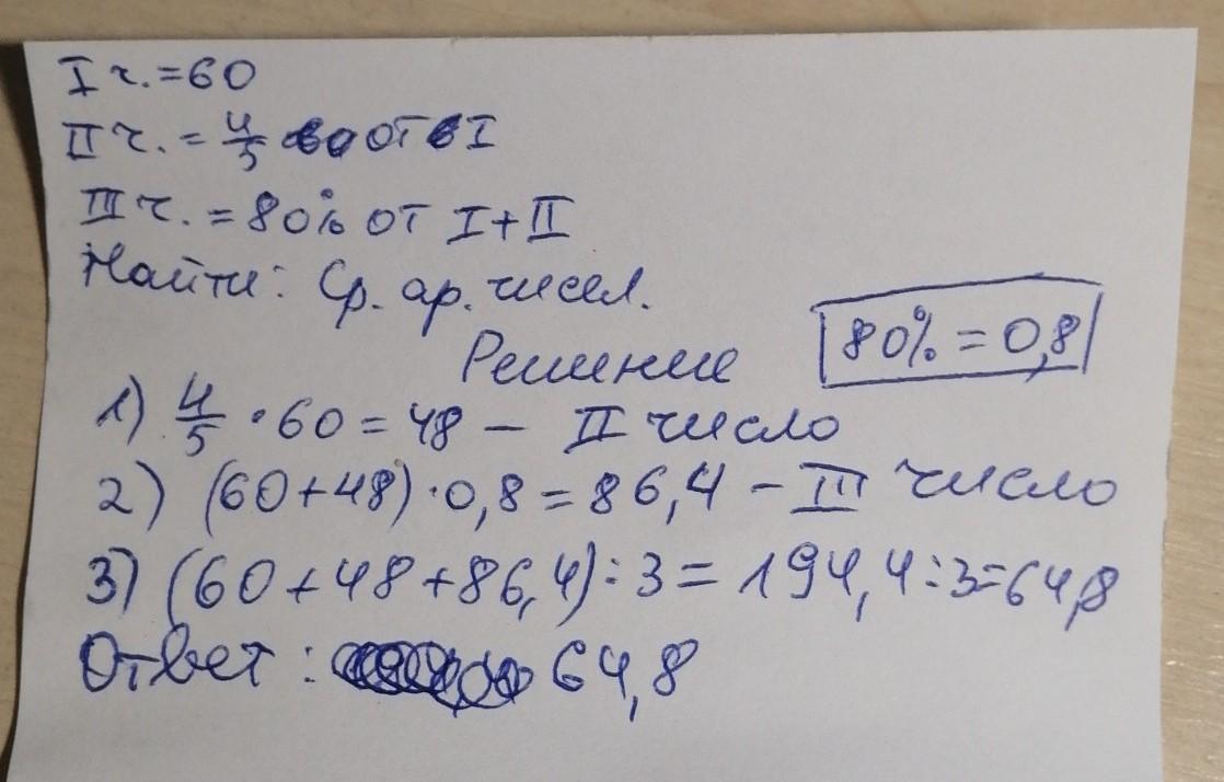 Первое число ровно 60. Второе состовляет 4/5 от первого, а теретье число состовляет 80% от суммы первого и второго числа. Найдите средние арифметическое этих чисел.