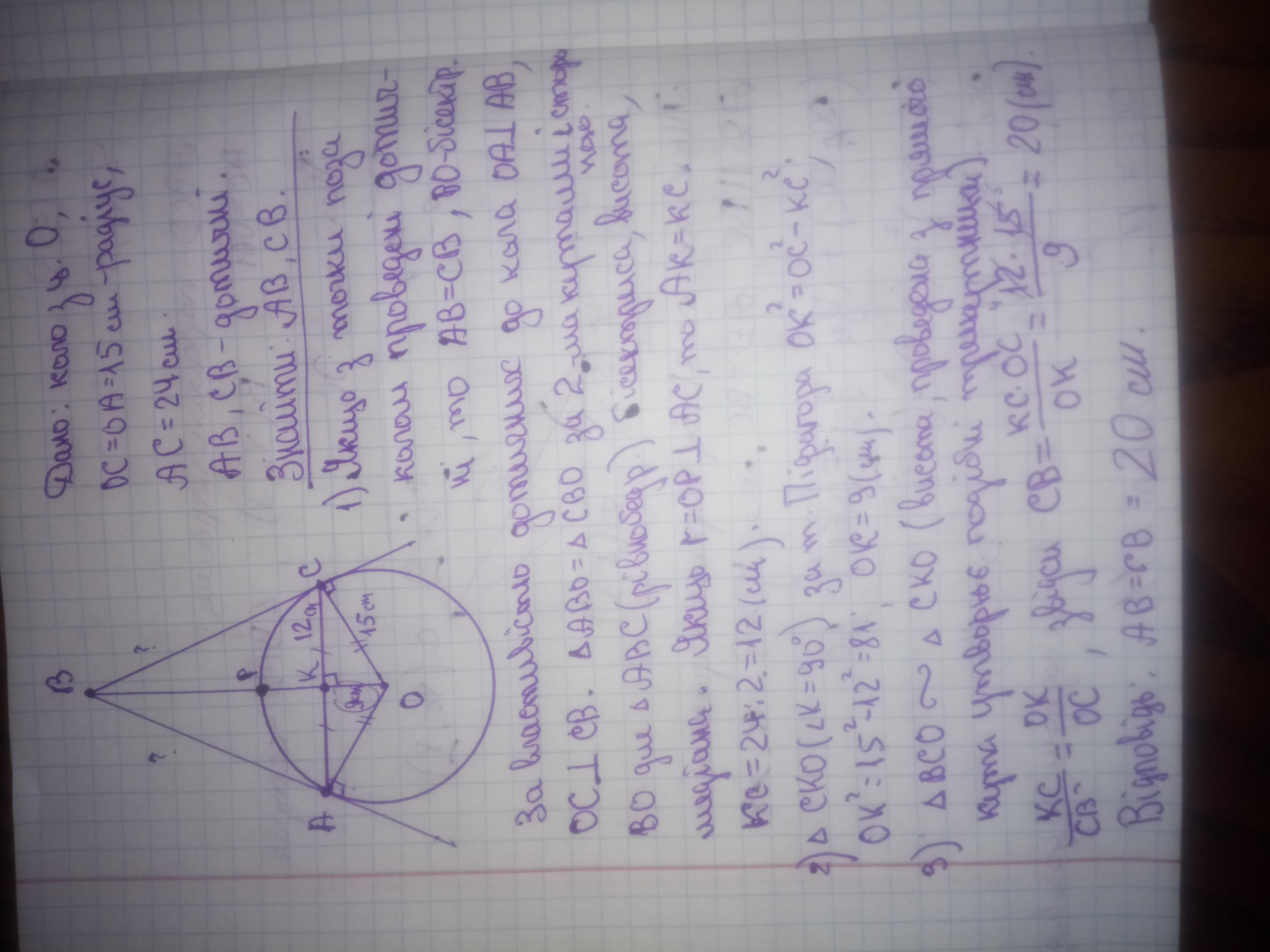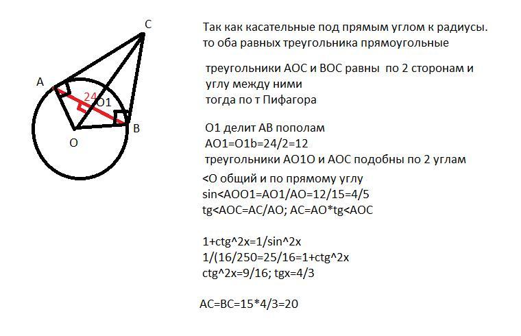 з точки B до кола проведені дві дотичні, відстань між точками дотику з колом дорівню 24см Знайдіть довжини дотичних, якщо радіус кола дорівнюе 15 см