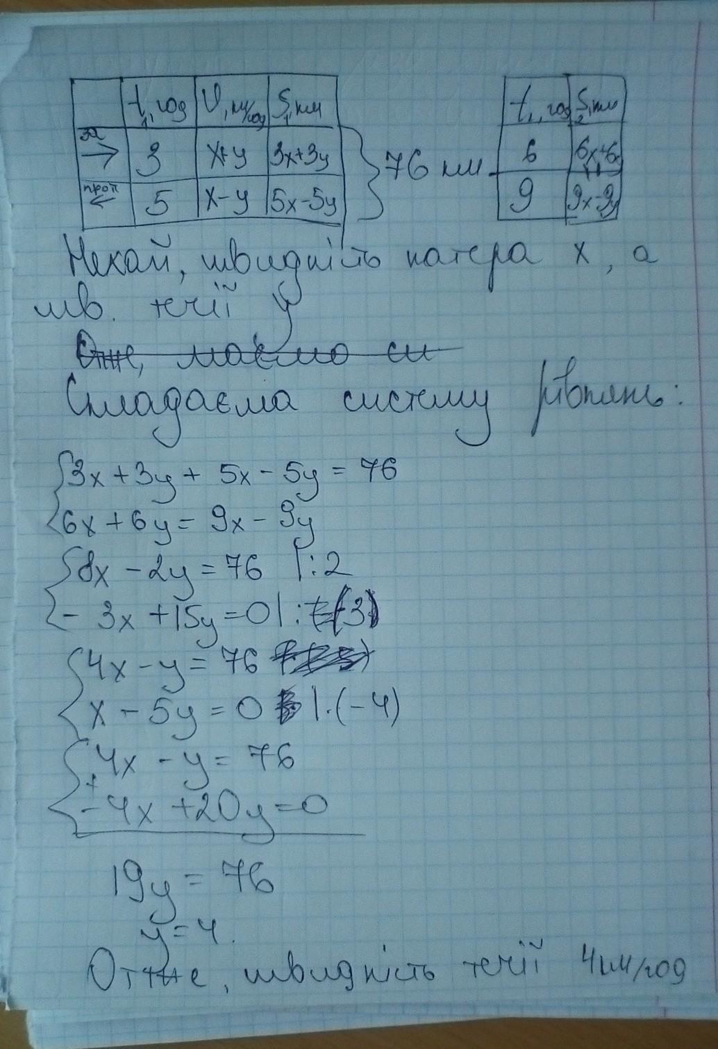 Катер за 3 години руху за течією і 5 годин проти течії проходить 76 км знайдіть швидкість катера якщо за 6 годин за течією він проходить стільки ж скільки за 9 годин проти течії
