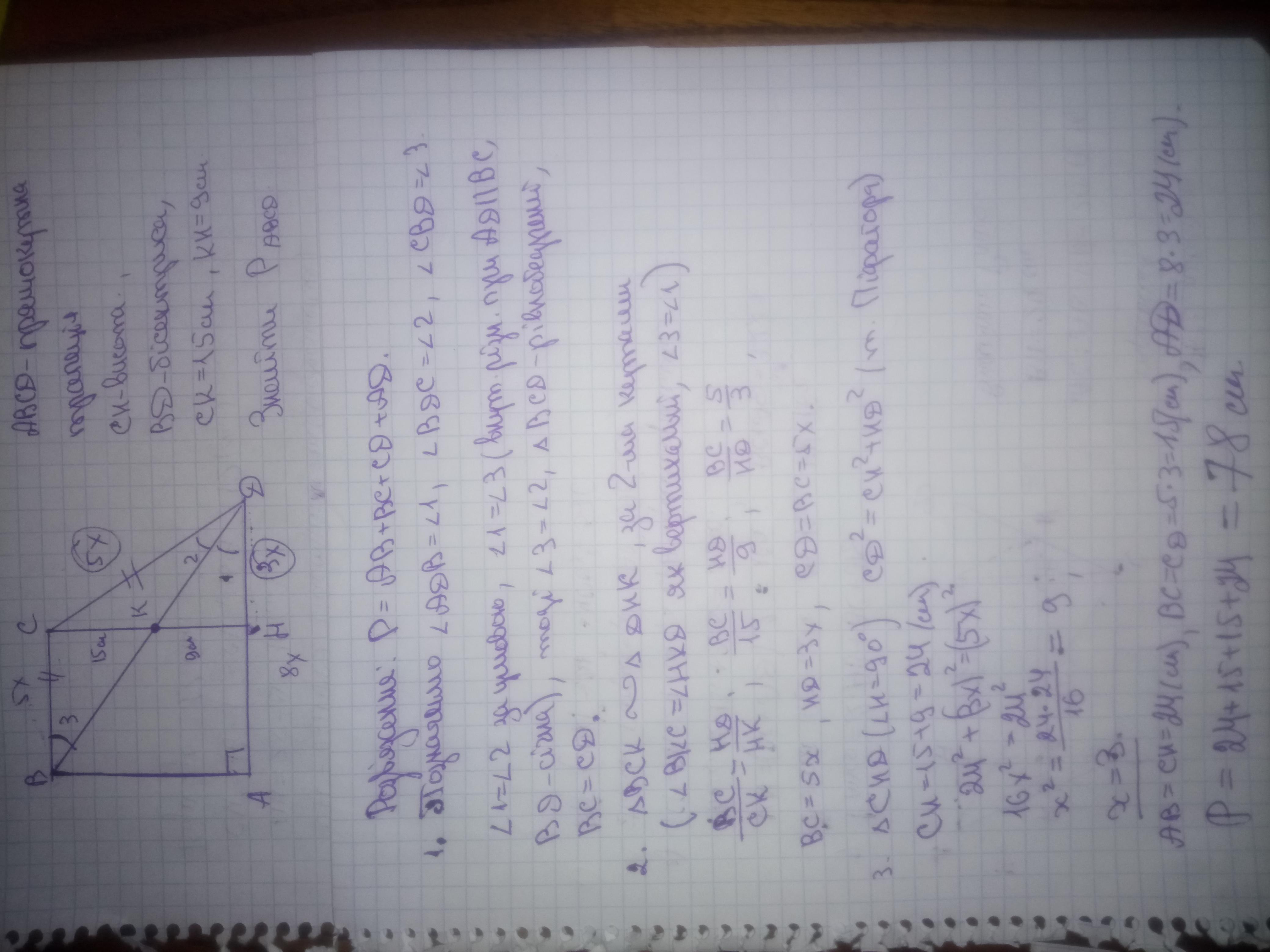 діагональ прямокутної трапеції ділить гострий кут пополам, а висоту, проведену з вершини тупого кута, на відрізки 9 і 15 см. Обчисліть периметр трапеції.