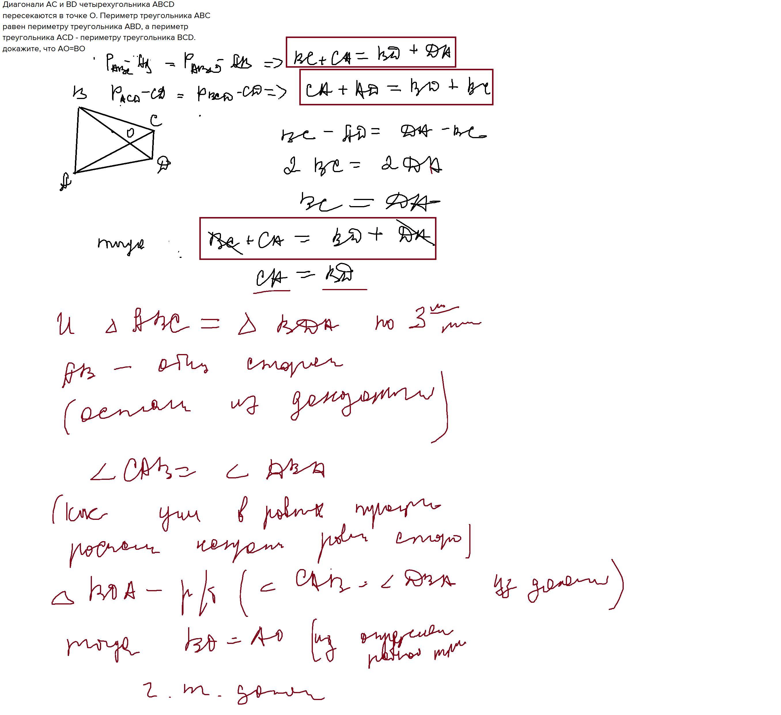 диагонали АС и ВD четырехугольника ABCD пересекаются в точке О. Периметр треугольника ABC равен периметру треугольника ABD, а периметр треугольника ACD - периметру треугольника BCD. докажите, что AO=BO
