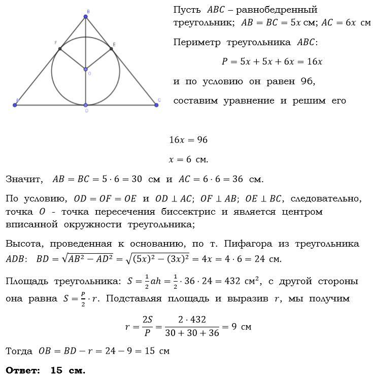 Периметр рівнобедренного трикутника дорівнює 96см, а бічна сторона і основа відноситься , як 5 : 6. Точка медіани, проведеної до основи однаково віддалена від бічної сторони і основи. Обчисліть відстань від цієї точки до вершини, протилежної основі.