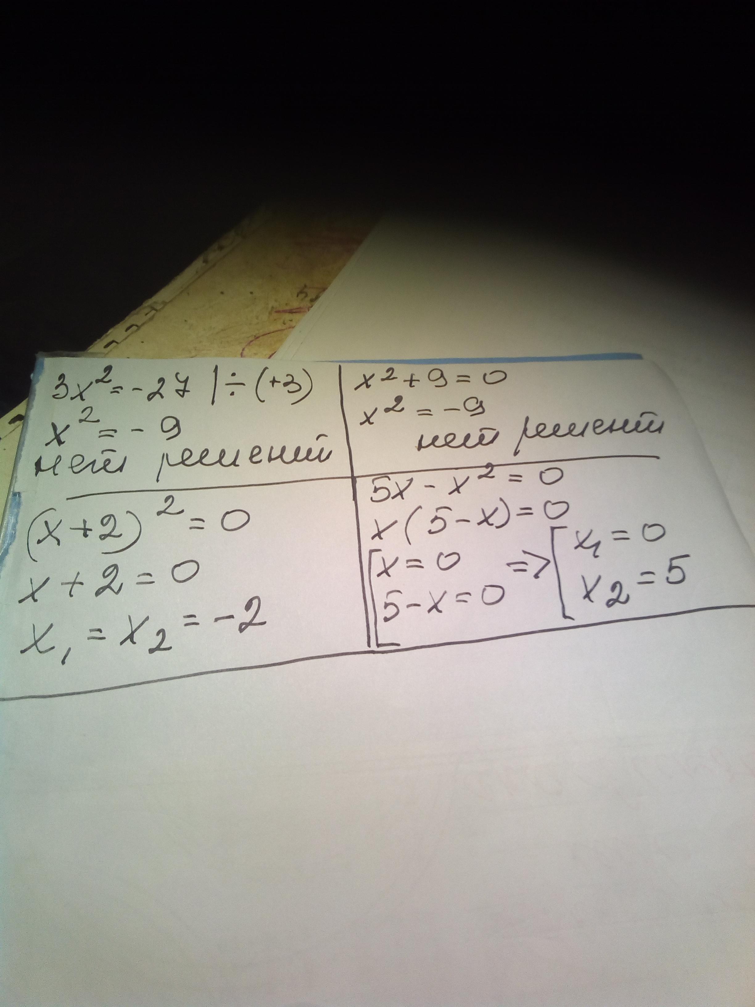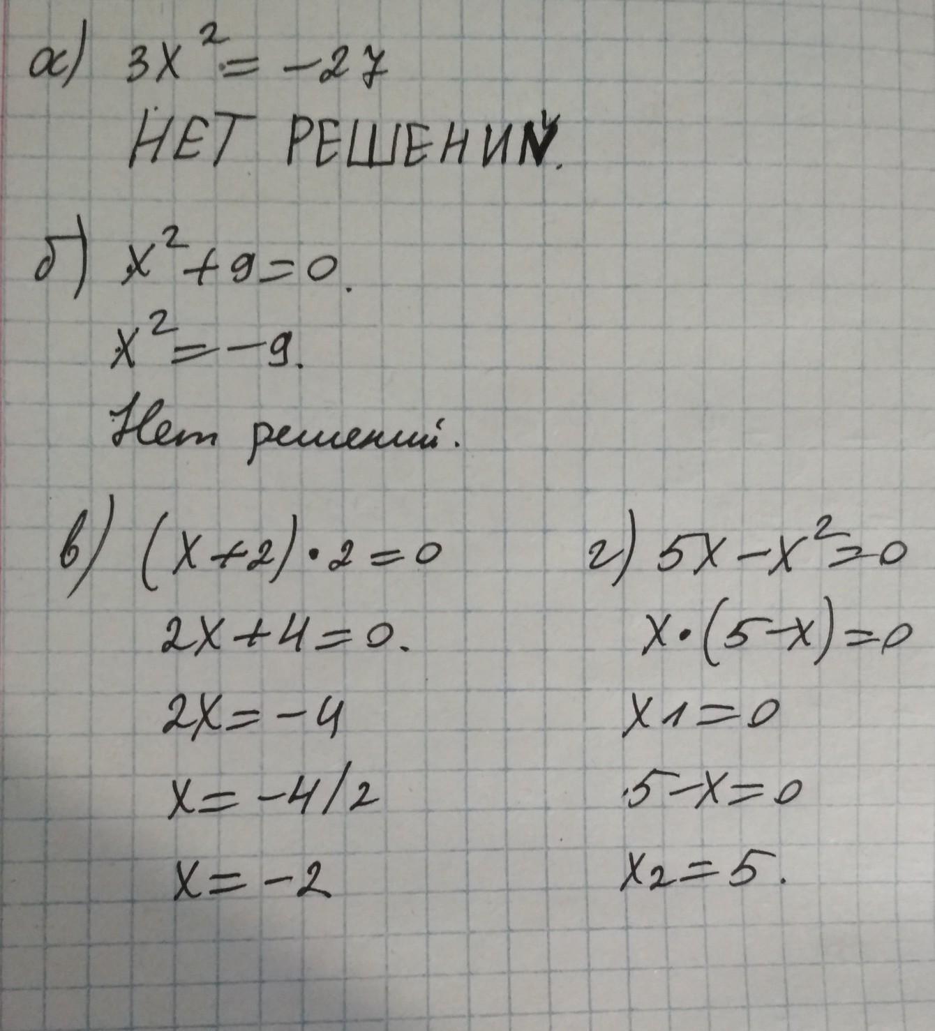 а) 3х2 = -27; в) (x + 2)2 = 0;