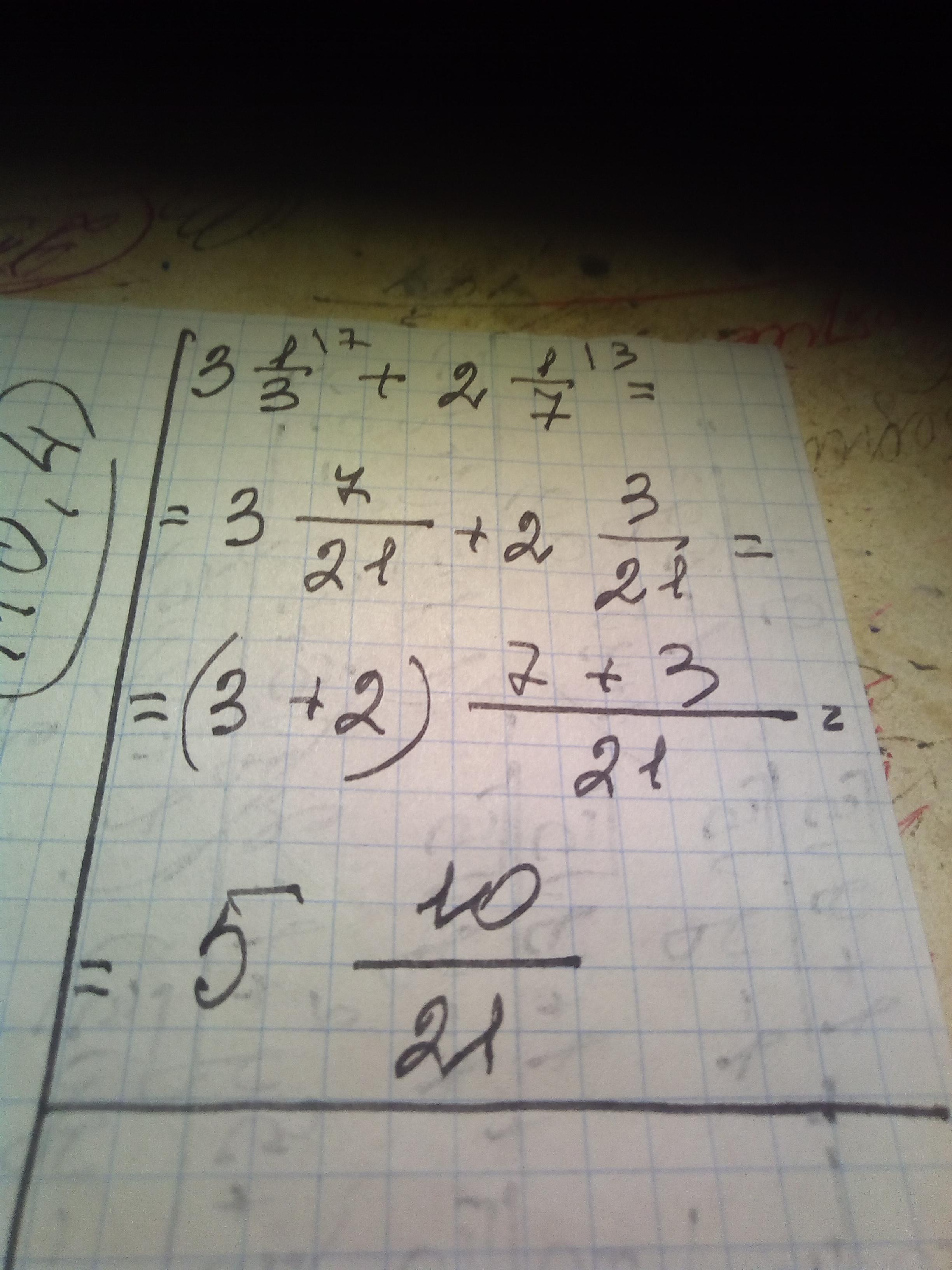 3 1/3 + 2 1/7 = 3 7/21 + 2 3/21 = (3 + 2) + (7/21 + 3/21) = 5 + 10/21 = 5 10/21