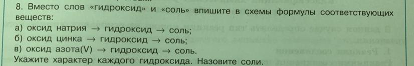 Вместо слов “гидроксид” и “соль” впишите в схемы формулы соответствующих веществ