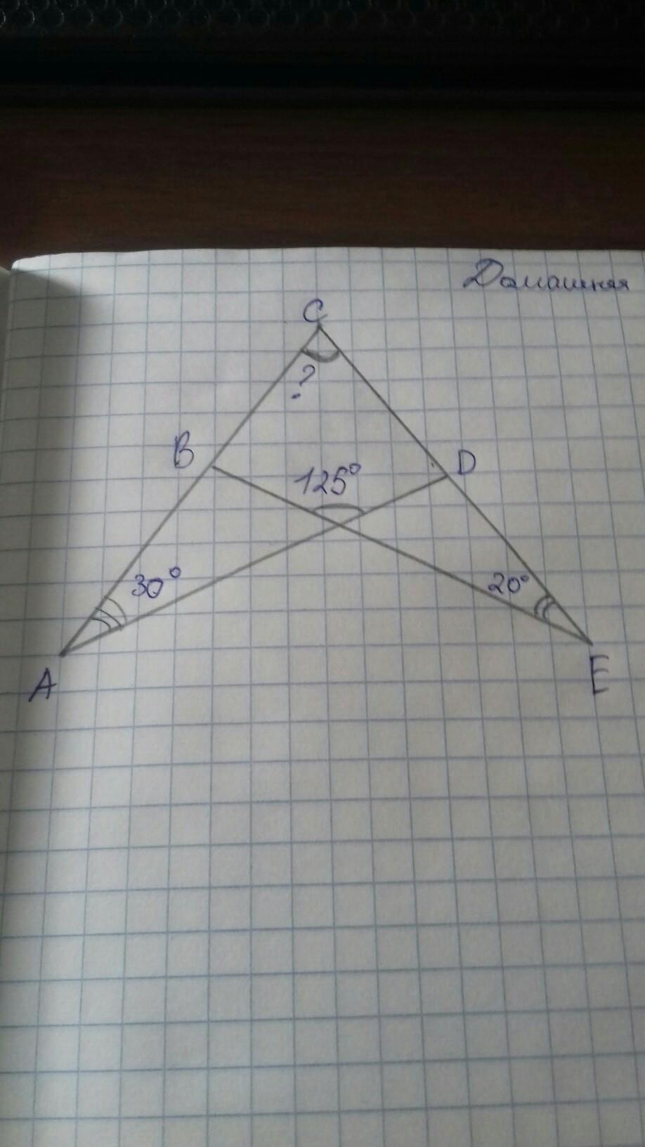 Аналогично для угла CDO, (DOE = 180 - 125 = 55°, EDO = 180 - 55 - 20 = 105°. CDO = 180 - 105 = 75°)
