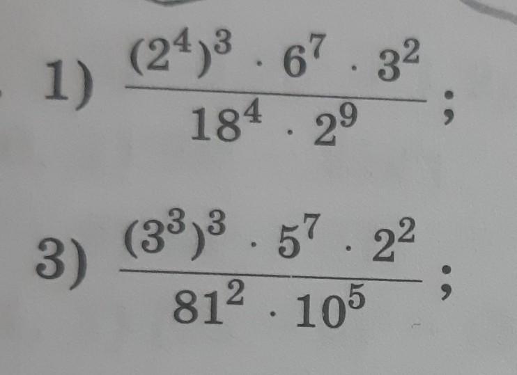 1) ((2^4)^3 × 6^7 × 3^2)/(18^4 × 2^9) = (2^12 × (3×2)^7 × 3^2)/((3×3×2)^4×2^9) = (2^12 × 3^7 × 2^7 × 3^2)/(3^4 × 3^4 × 2^4 × 2^9) = (2^12 : 2^13) × (3^9 : 3^8) = 2^-1 × 3 = 1,5