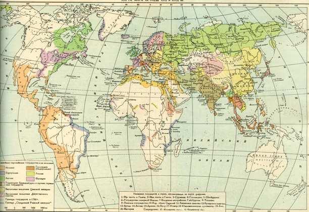 Ведущие государства мира в XVIII веке: Россия, Франция, Англия, Испания, Португалия, Голландия (Нидерланды), Цинская империя, Германские государства и Джунгарское ханство.