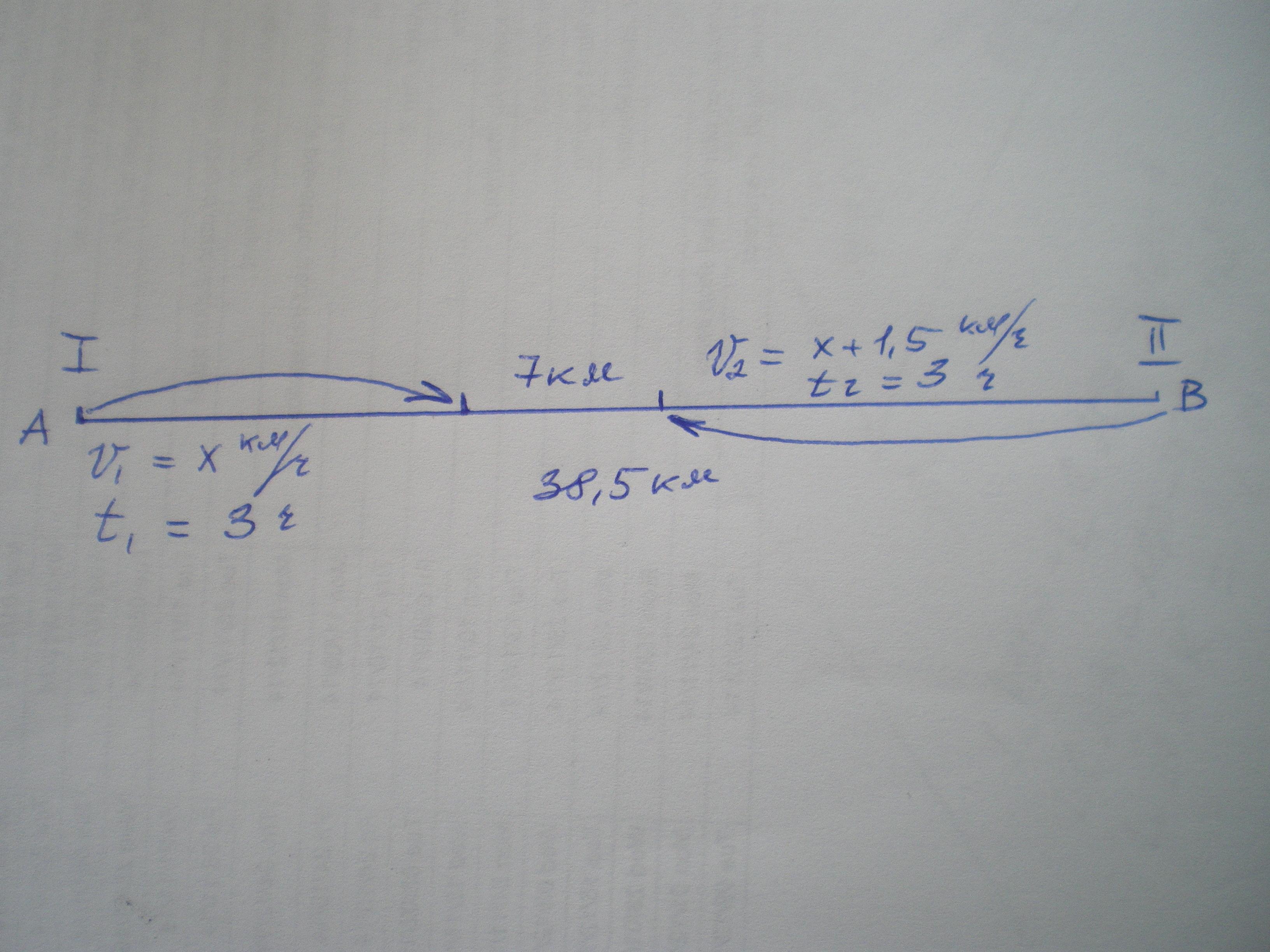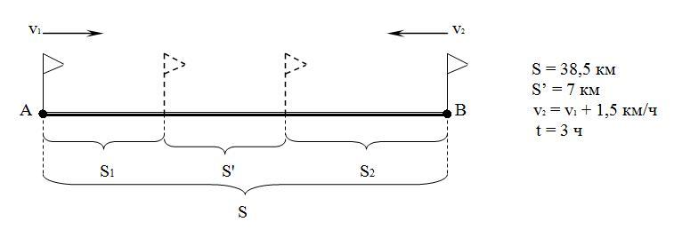 Решить задачу: Два пешехода вышли на встречу друг другу из пунктов А и Б , расстояние между которыми равно 38, 5км. Через 3 часа расстояние между ними уменьшилось до 7 км. Найдите скорость каждого пешехода, если скорость первого была на 1,5 км/ч меньше скорости второго