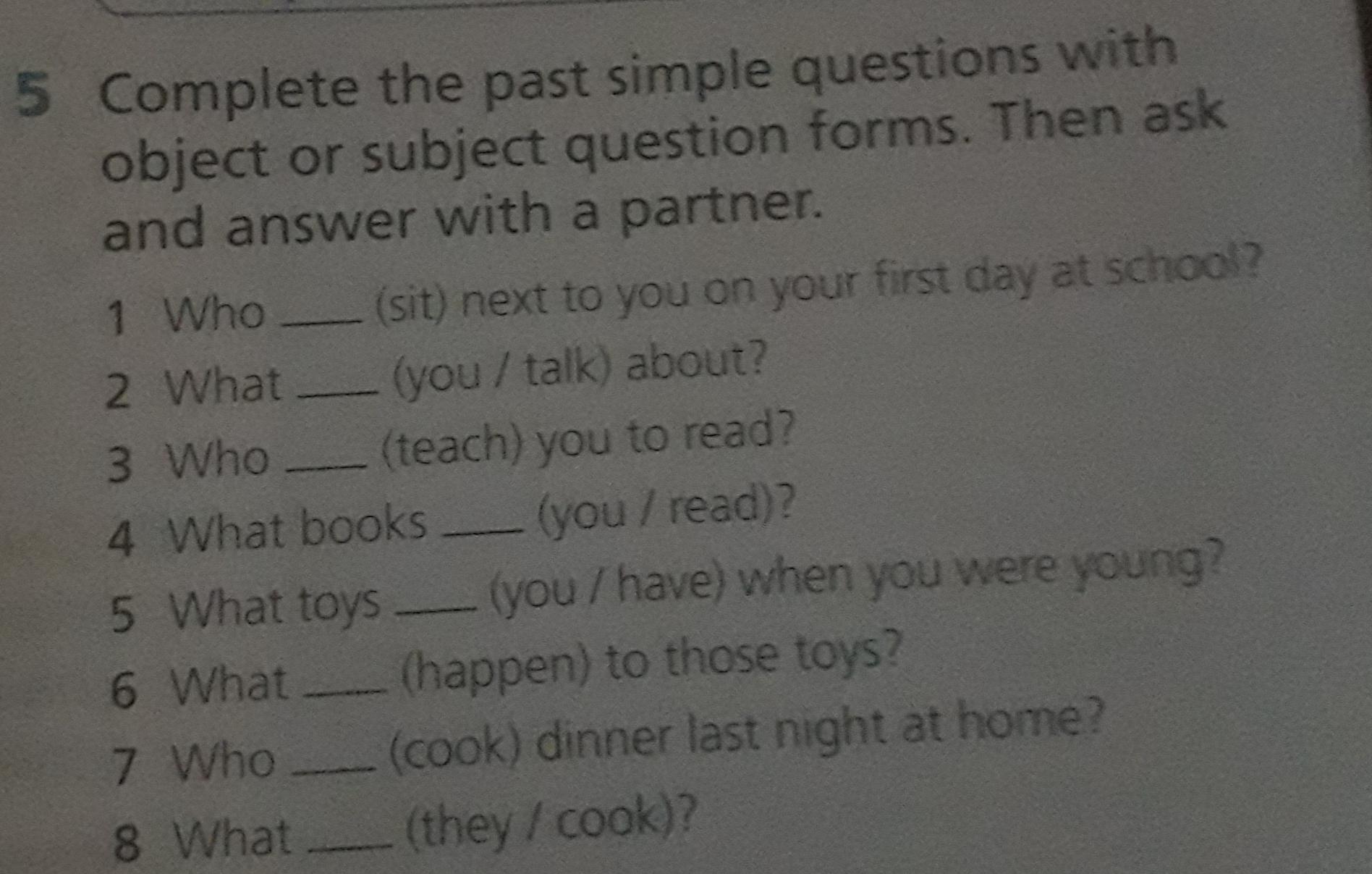 5 Complete the past simple questions with object or subject question forms. Then ask and answer with a partner.