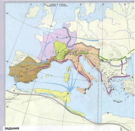 Б) Определите и подпишите, направление переселения каких народов показаны на карте. Обозначьте направления похоов гуннов, крестом обозначьте сражение, в котором гунны потерпели поражение, подпишите его незвание и дату.