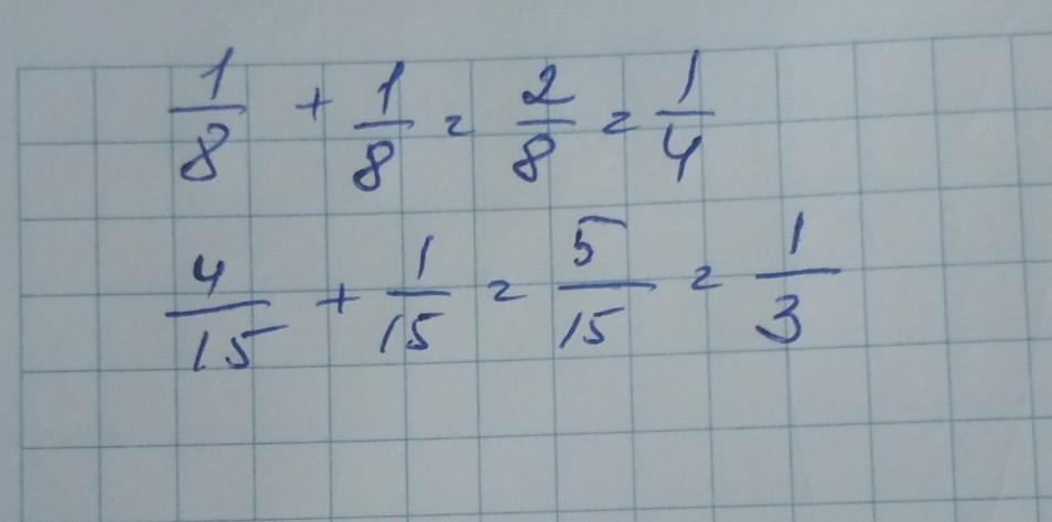 Б) 4/15 + 1/15 = 5/15 = 1/3