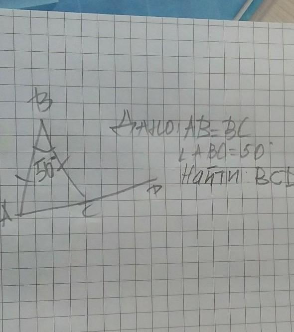 Объяснение: угол ВАС=Углу ВСА т.к. углы при основании равнобедренного треугольника равны значит 180°-угол АВС=Угол ВСА,180-50 = 130° если угол ВАС=углу ВСА = 130: 2= 65° т.к. внешний угол треугольника равен сумме двух не смежным с ним то угол ВАС + угол АВС = углВСD 50°+65°=115°