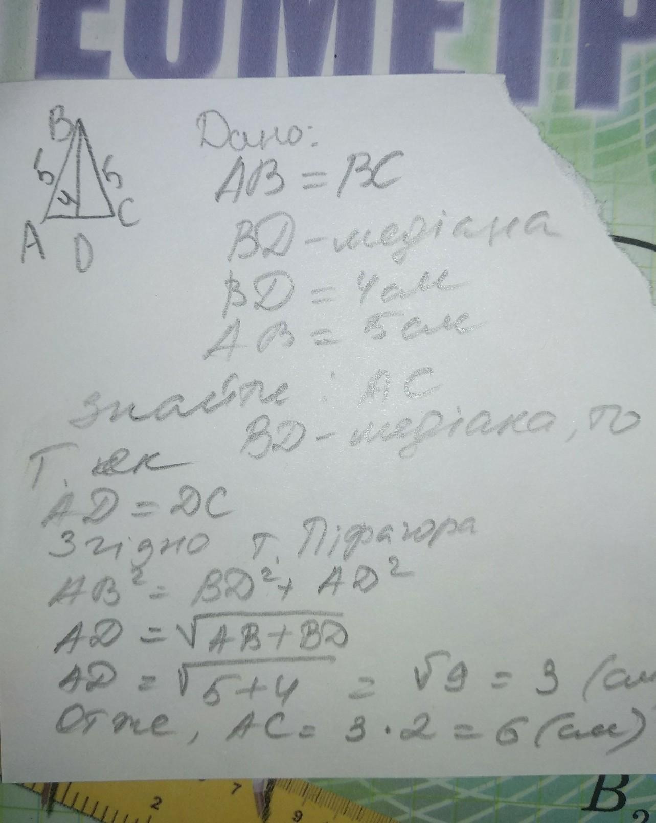 В рівнобедреному трикутнику АВС (АВ=ВС) BD медиана BD= 4 см AB=5 см. Знайдіть основу АС