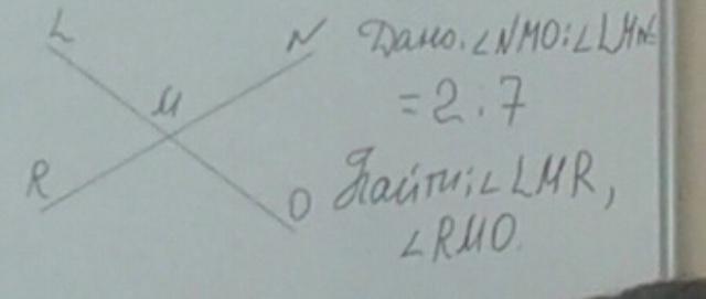 LMO это угол 180°(сумма угловLMN и NMO)следовательно 2+7(узнаем чему ровна единица соотношения и умножим просто.) 180:9=20(одно соотношение. у нас по условию что углы относятся как 2:7 . 2*20=40° а 7*20=140*.