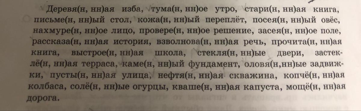 Дерево → деревянная, туман → туманное, старина → старинная, письмо → письменный, кожа → кожаный, стекло → стеклянные, камень → каменный, олово → оловянные, пустыня → пустынная, нефть → нефтяная.