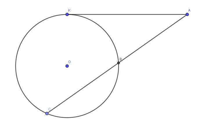 Через точку A, лежащую вне окружности, проведены две прямые. Одна прямая касается окружности в точке K. Другая прямая пересекает окружность в точках B и C, причём AB=6, BC=48. Найдите AK.