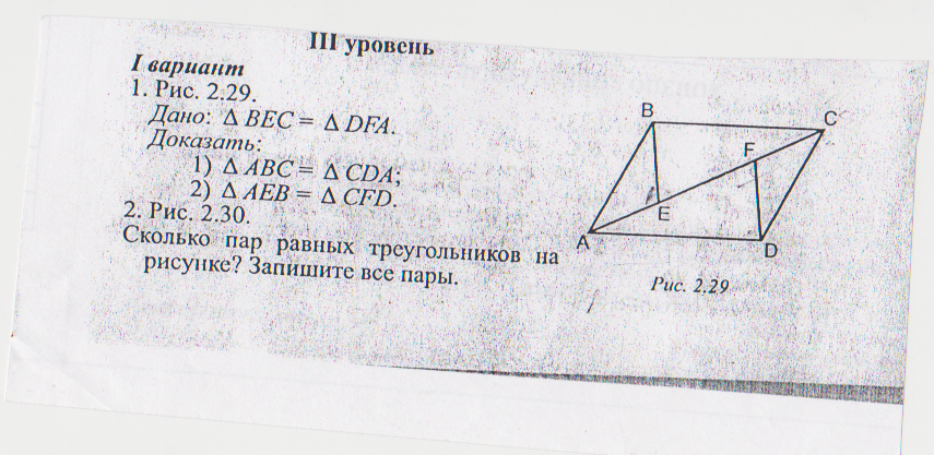 В равных треугольниках ВЕС и ДФА - АД=ВС, ВЕ=ДФ, уголСАД=уголАСВ, если при пересечении двух прямых (АД и ВС) третьей (АС) внутренние разносторонние углы равны (уголСАД=уголАСВ)то прямые параллельны, АД параллельна ВС, четырехугольник у которого две стороны равны и параллельны - параллелограмм (теорема), значит АВ=СД и АВ параллельна СД, уголВ=уголД в параллелограмме, и угол СВЕ=уголАДФ отсюда уголАВЕ=уголСДФ, треугольники АВЕ=треугольникСДФ по двум сторонам (АВ=СД, ВЕ=ДФ) и углу между ними, треугольник АВС=треугольнику АДС, АД=ВС, АВ=СД, уголД=уголВ