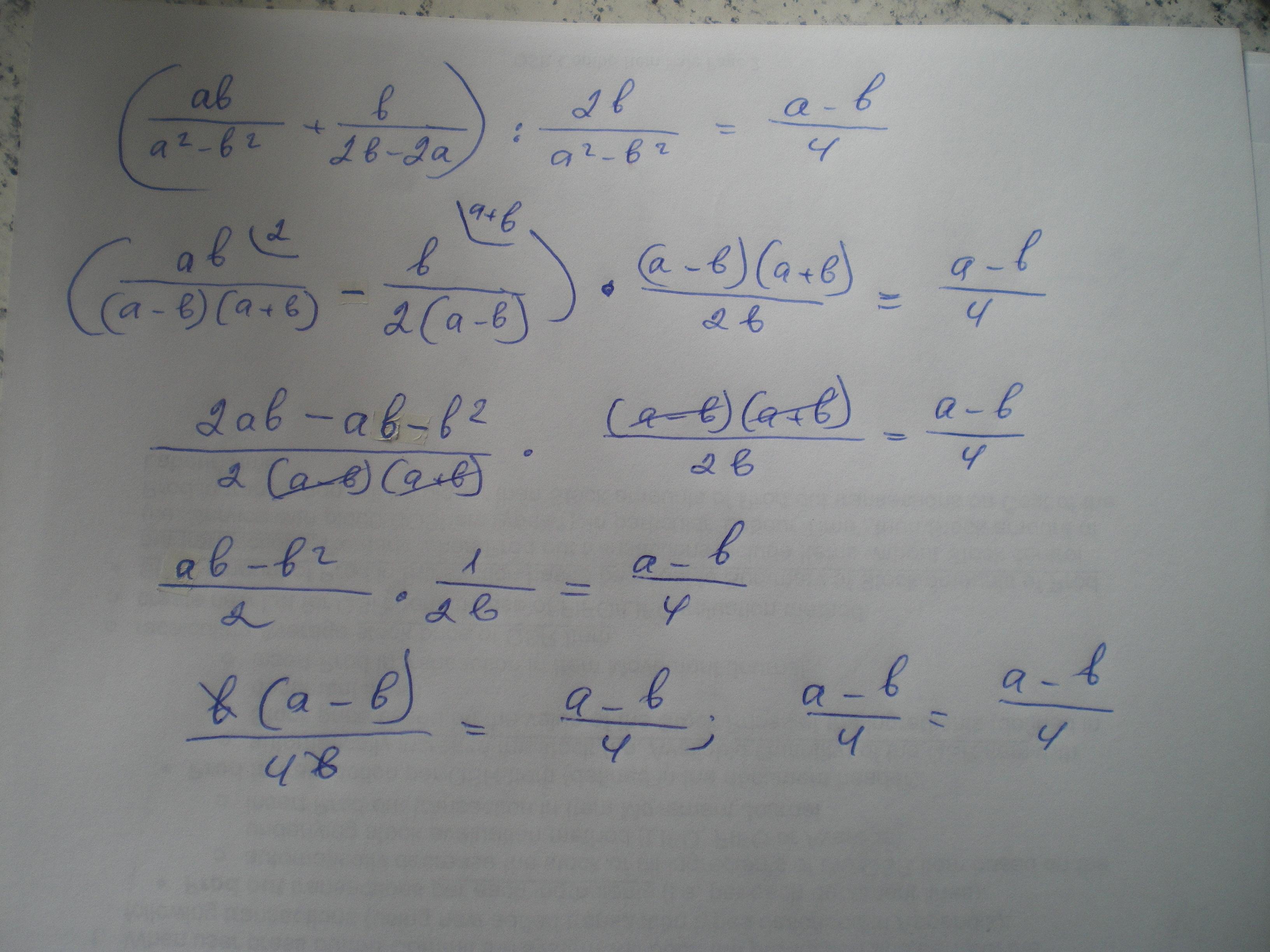 докажите тождество (ab/a^2-b^2+b-2b-2a):2b/a^2-b^2=a-b/4