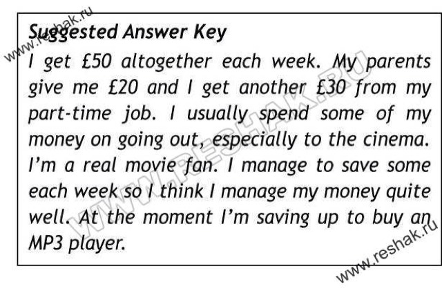 Каждую неделю я получаю 50 фунтов. Мои родители доют мне 20, 30 же я получаю с моей подработки. Обычно,какую то часть я трачу на развлечения ( пойти погулять или что то ещё) , особенно на кино. Я настоящий киноман. Каждую неделю мне удается оставить ( не тратить) немного, и я думаю, что я управляю( распоряжаюсь) своими деньгами довольно хорошо. На данный момент я коплю на новый MP3 плеер.