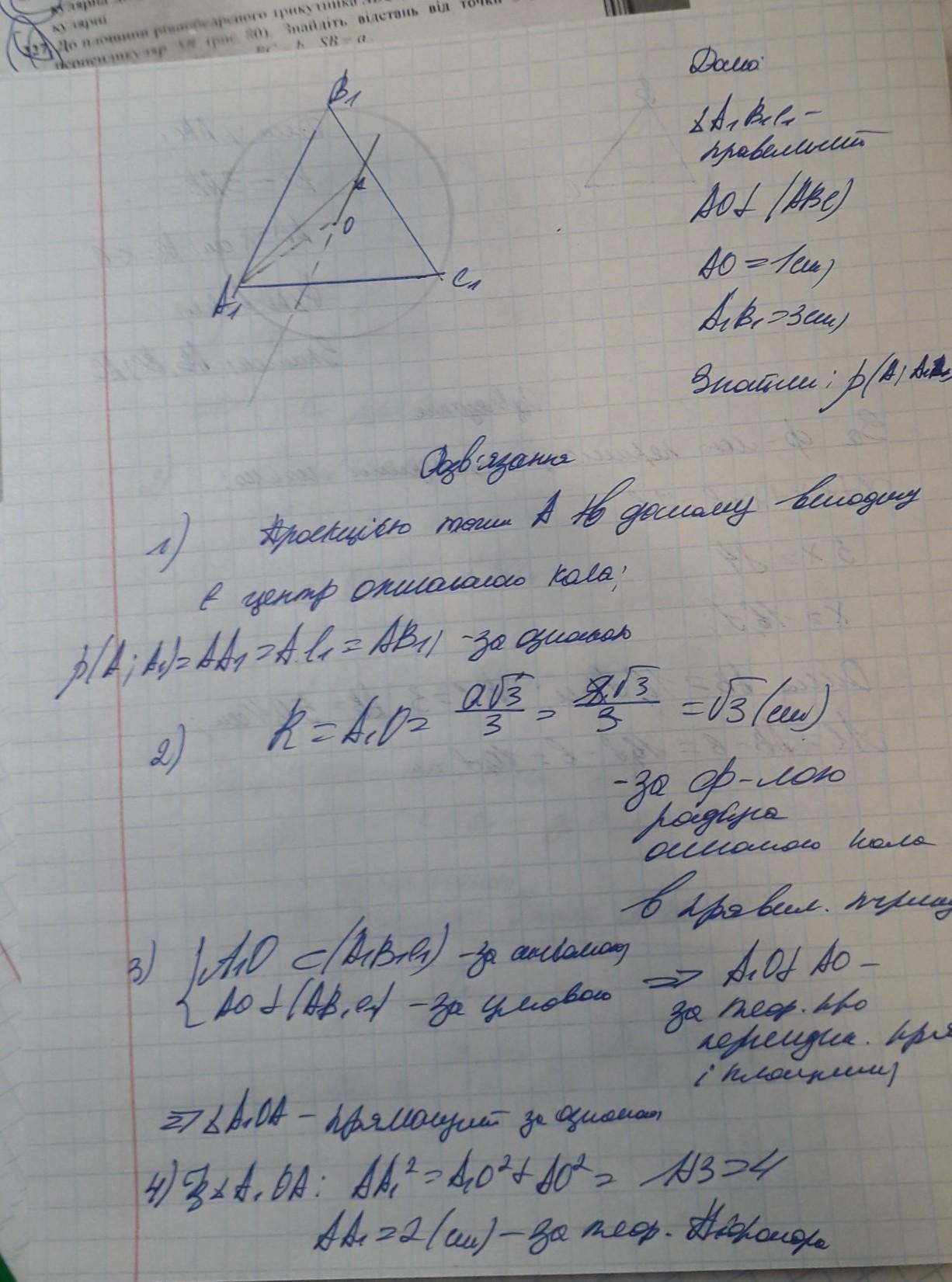 Сторона рівностороннього трикутника дорівнює 3 см. Точка А рівновіддалена від вершин трикутника і знаходиться на відстані 1 см від площини трикутника. Знайдіть відстань від точки А до вершин трикутника.