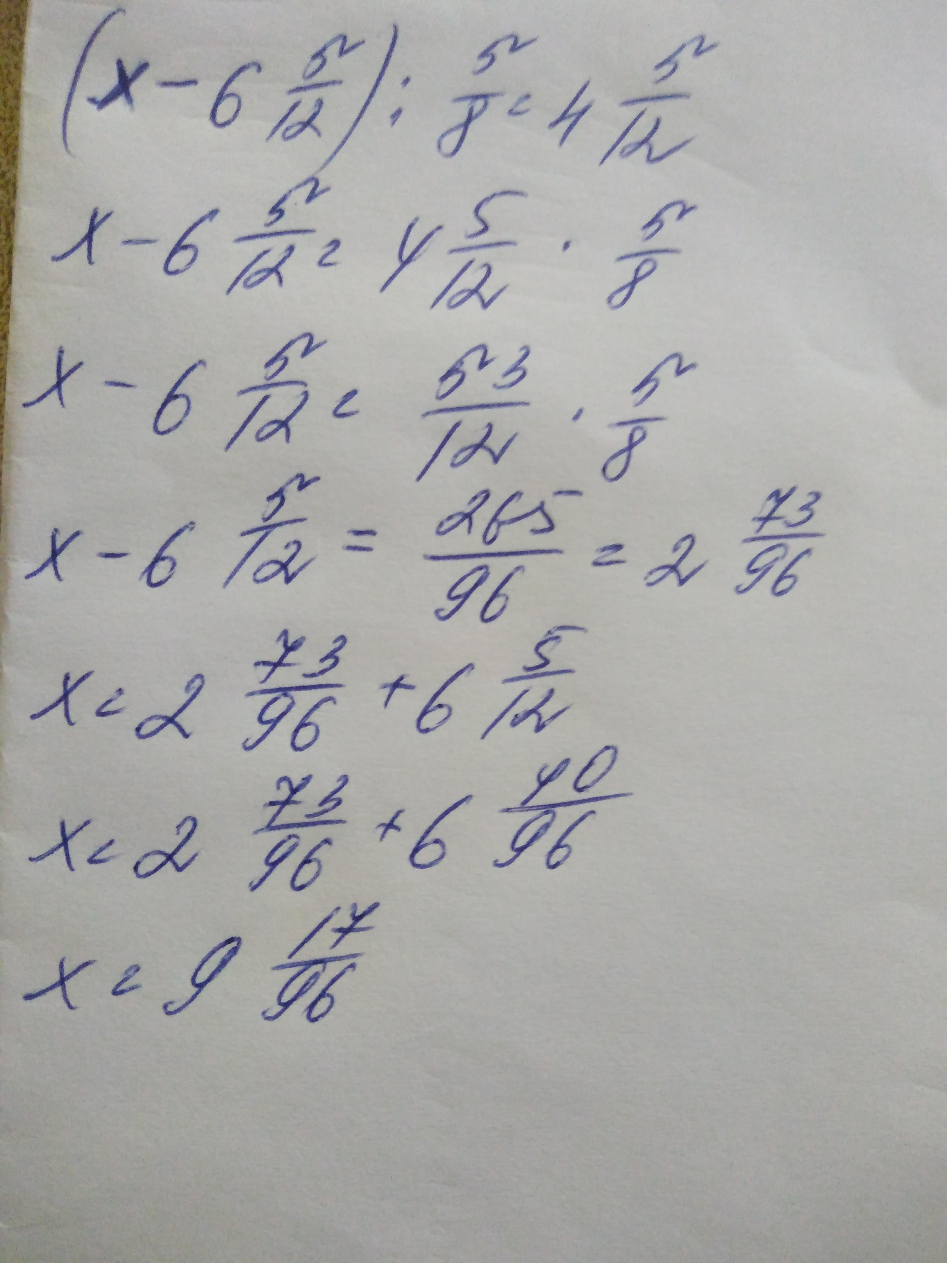 Помогите пожалуйста решить пример !Очень срочно с объяснением (x- 6 5/12): 5/8=4 ,5/12 это дробь и 5/8 тоже дробь а 6 эта целая часть .Даю 30 баллов