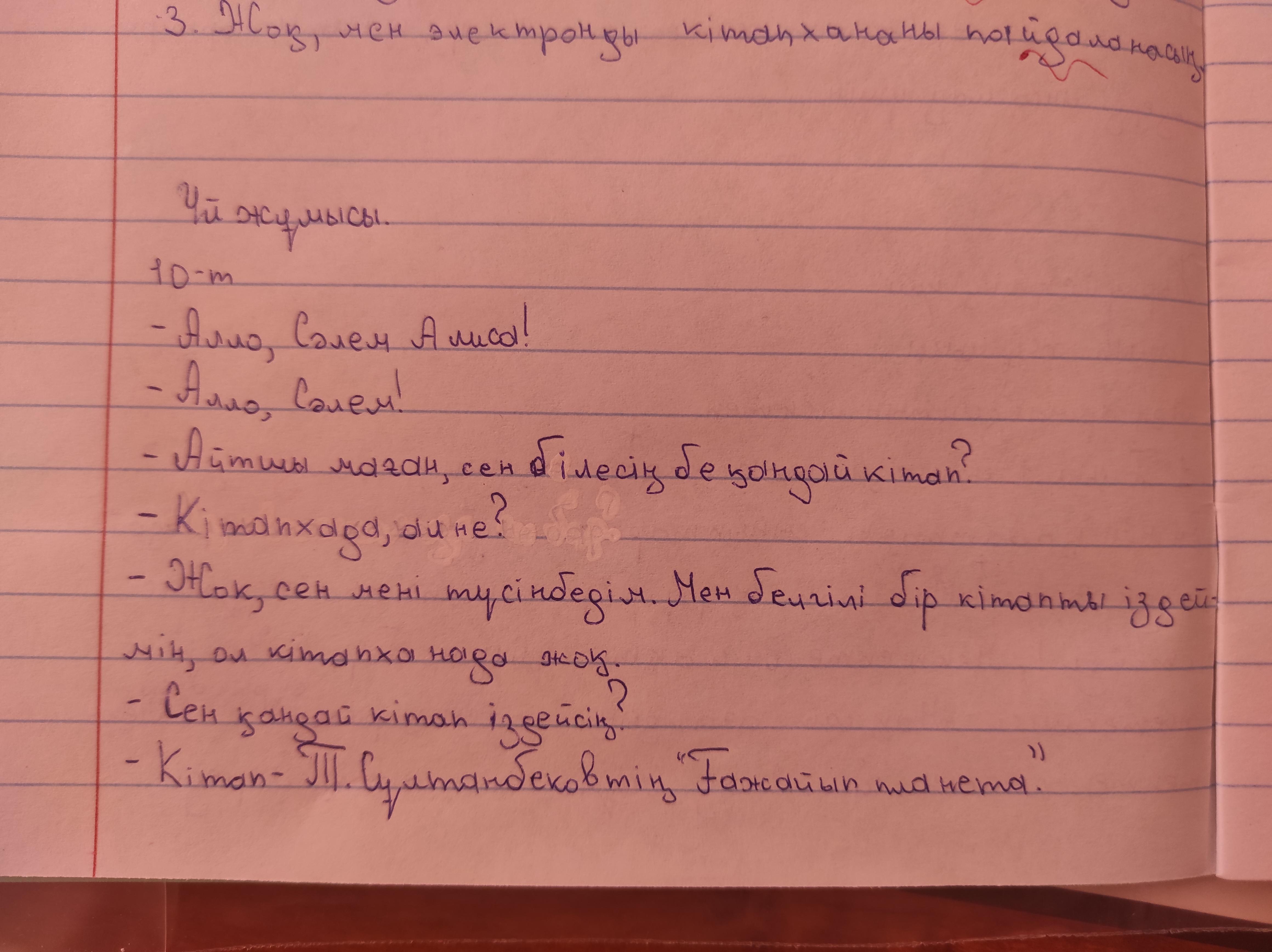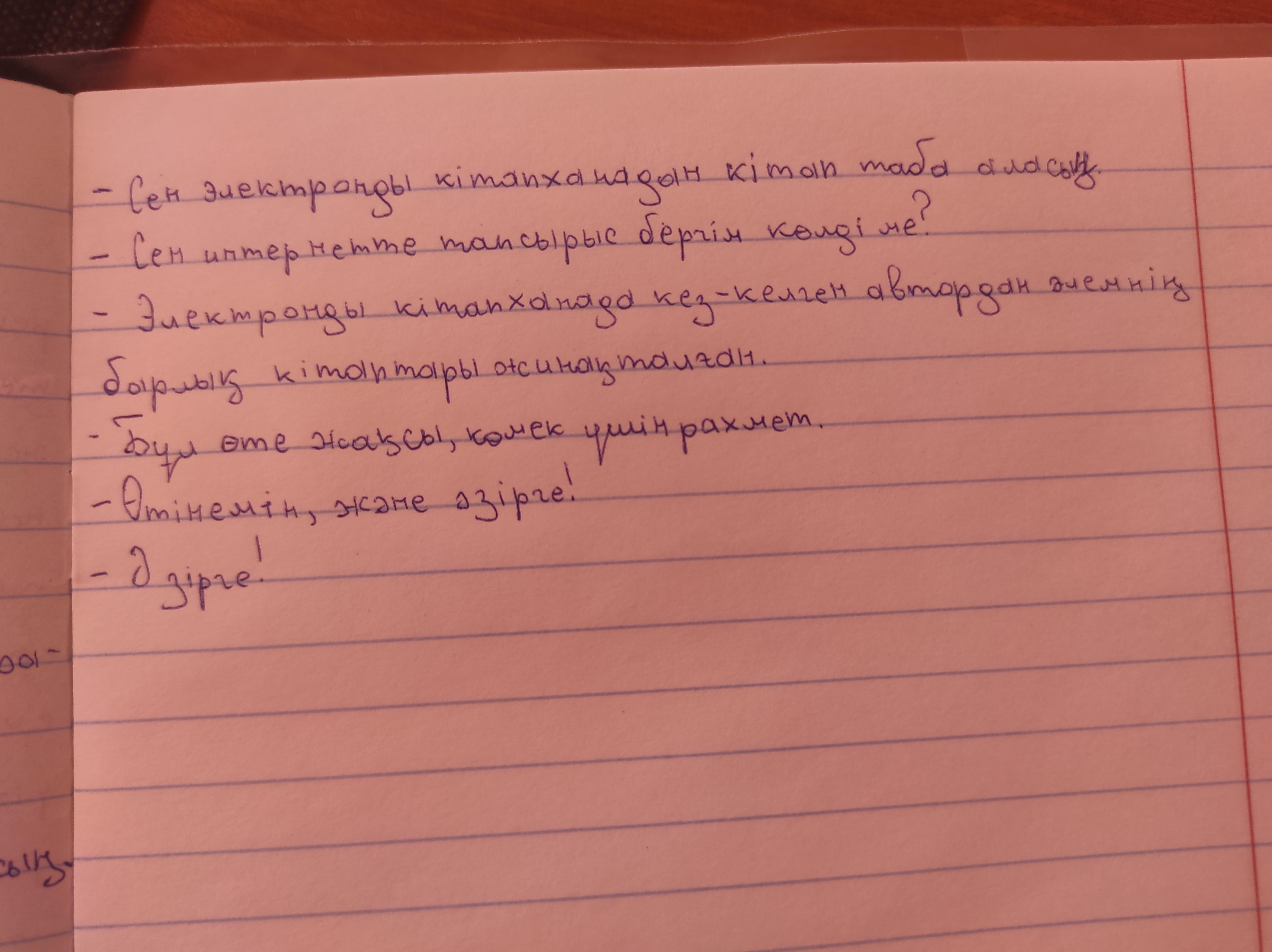 жағдаяд :досың Т. Сұлтанбековтің "Ғажайып планета" атты шығармасын кітапханадан таба алмапты. Досың саған телефон соғып, электронды кітапхана туралы сұрады. Сөйлесіңдер.